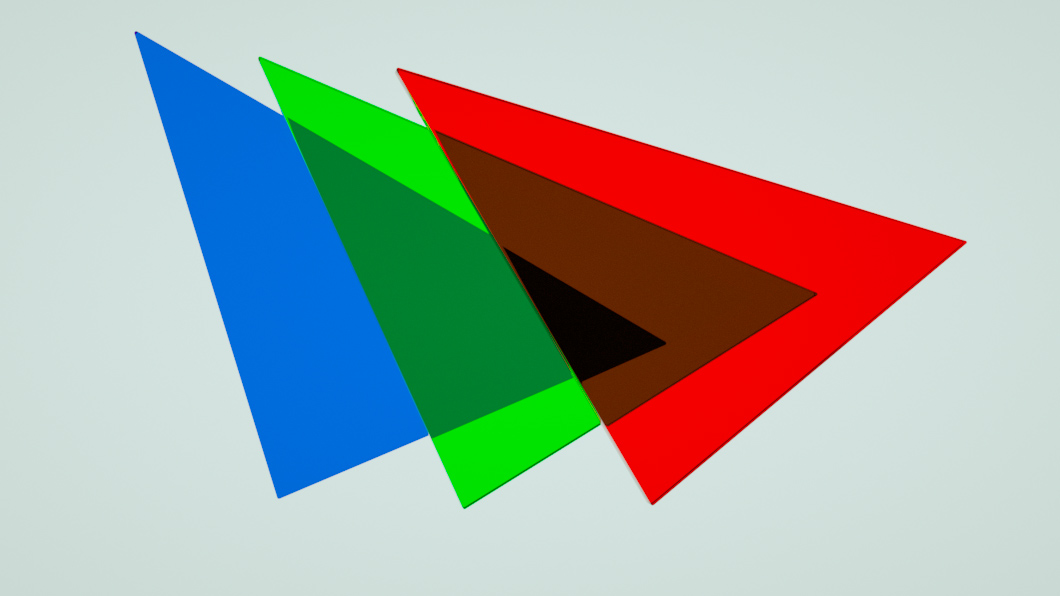 I was puzzled when you said you tried this in real life and it was like in the logo... as far as I know, colored panels block light, the red one only lets red go through etc... and each layer acts in a substractive manner. I don't see why superposing several colored layers would add instead of substract.