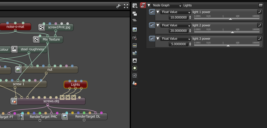 You can now create a node graph and hide some complex node set up. As in the old system, the interface to the "outside world" is done via input / output linker nodes, but now you can create multiple output linkers and input / output linkers can have now every pin type. Here for example, the node graph "Lights" contains three emitters and has three input linkers to control their power: