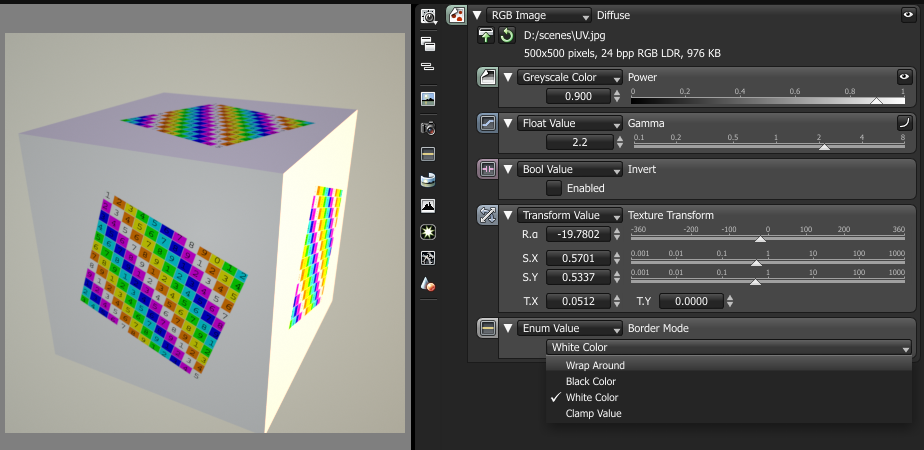The scale float pin was replaced by a texture transform pin and a border mode was added: I guess the options are self-explaining. Btw, the pin replacement and the required conversion of old scene files was what originally triggered the node system re-factoring.