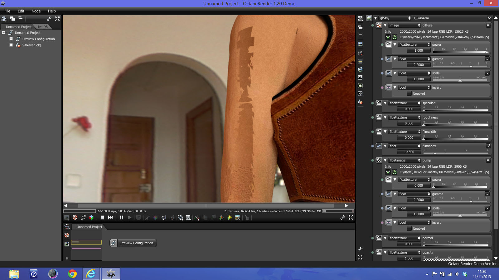 Thanks for the suggestions - I have updated the Demo to 1.2 and also loaded an updated driver for my graphics card. The "dark edges" issues seems to have gone away, but I am now getting the artifacting on the arm as in the attached screen grab. Even reducing the bump to zero does not cure this. Again, all ideas welcomed - and thanks for the help so far.