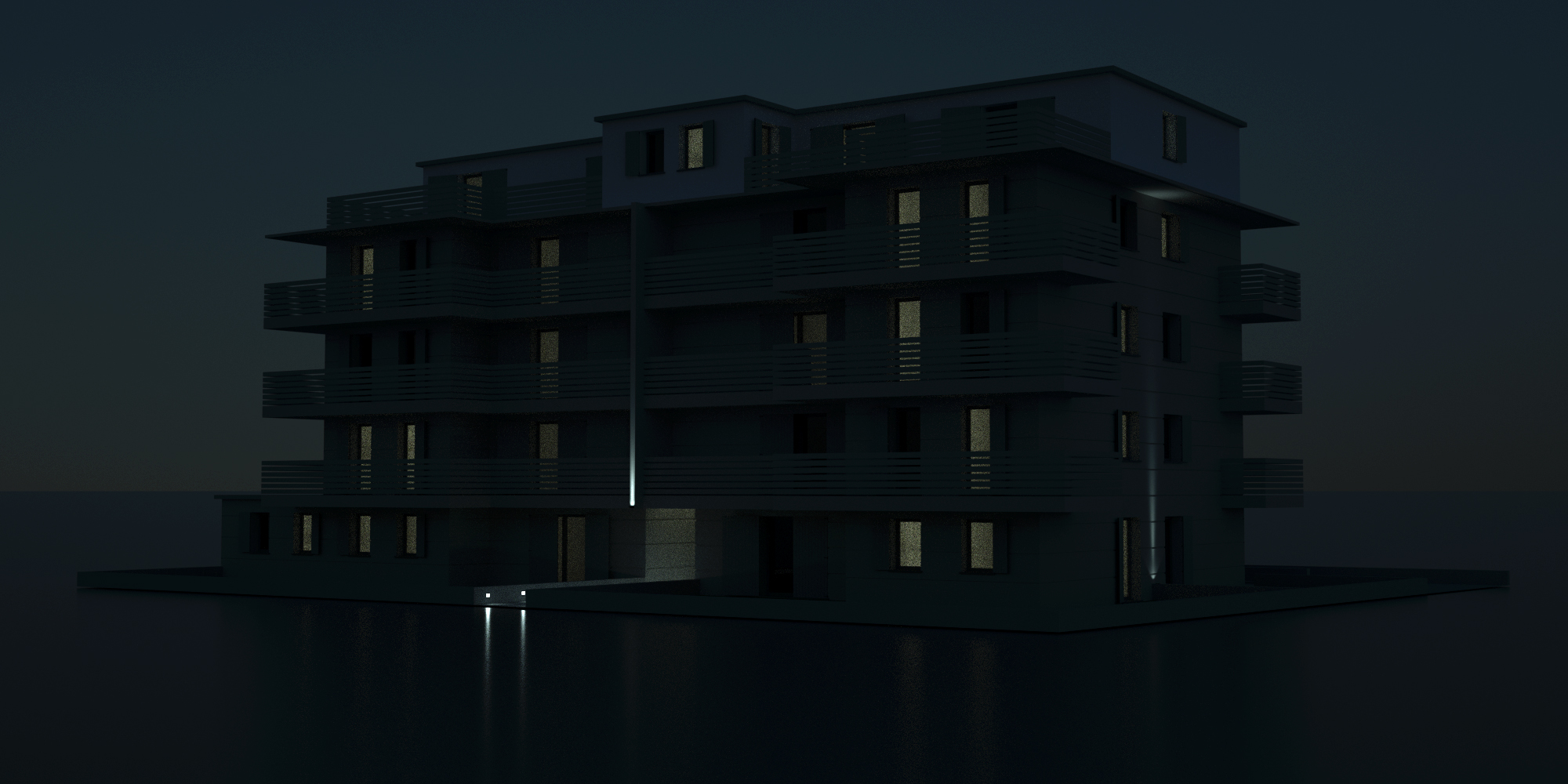 For the exterior use a hdr of dusk and play with exposure, i also used a lot of ies lights to light the balconies.