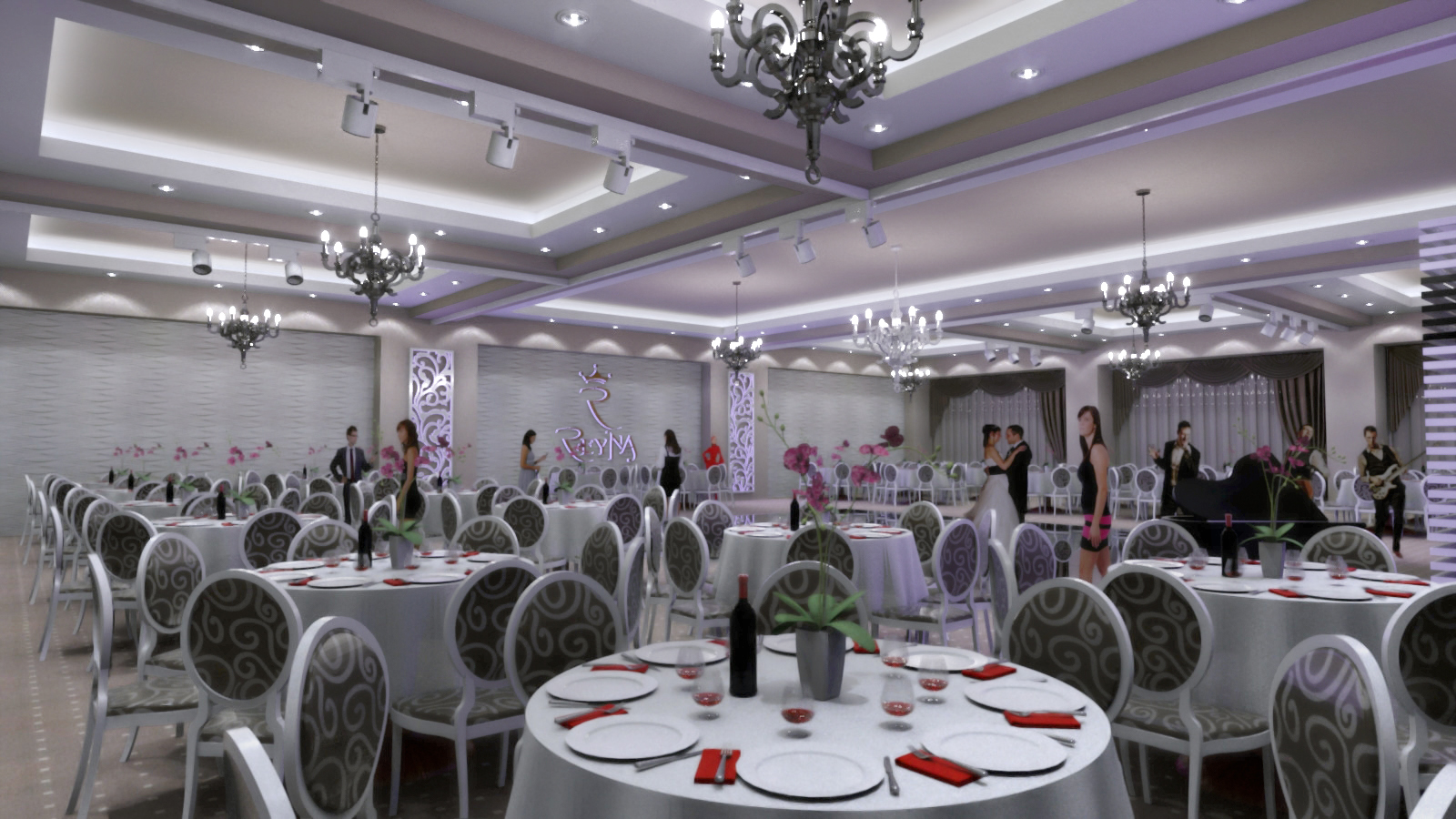 Either the plates are too big or the tables too small relative to the places - not a lot of room for arms shoulders. Chairs might be annoyingly close together with people moving around too back to back that is. Chairs/tables look impossibly regimented as arrays. Might want to vary just slightly to ease the eye into more realism. Plants and bottles too.