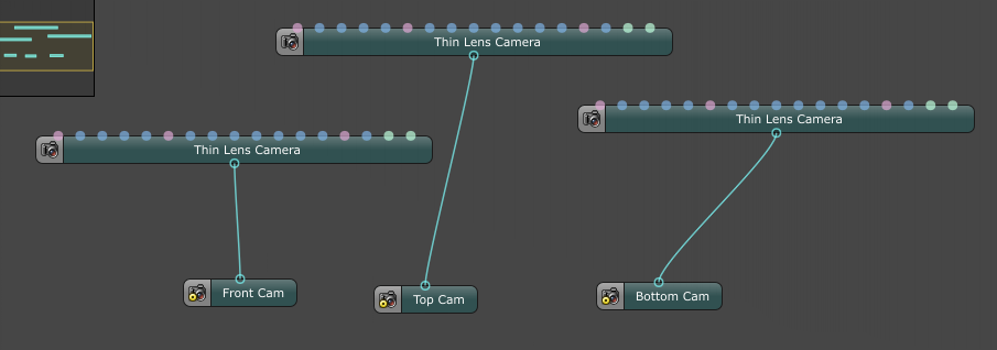 the problem i am having or the way i am trying to use them; and there may be another node for this that i dont know about; is much like a material macro. when you open it you have your nodes in it, but on the main scene tab you only see the one. i would like to do this with cameras... this way all render targets would connect to the one camera node, then to change the camera i would do that within the macro; just like if you wanted to change a material, just reconnect 1 inside the macro rather than in my case 3 connections every time i update a camera.