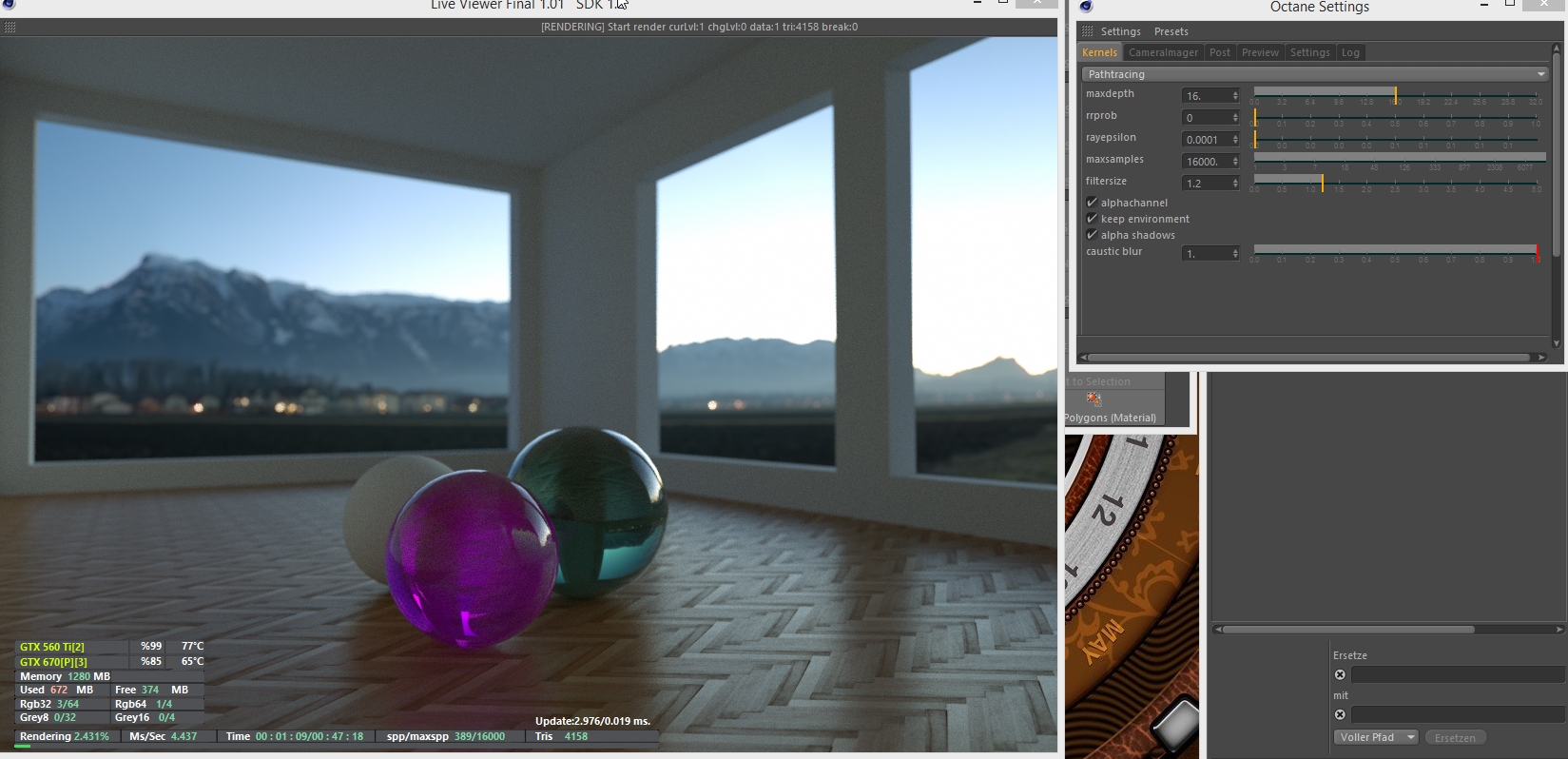it is weird. Yesterdy I had this bad results I showed but today the same scenes are perfect. Your scene untouched is perfect like yours and my scene as well. I figured out that the problems seem to be related to my big HDRI files (160 MB). Today Octane stated a memory error using such files. Yesterday the same files had no errors but may have been the reason for the noisy results? My graphics cards supply 2GB and 1GB. I thought that should be enouph for handling such fils. But obviously it is'nt.