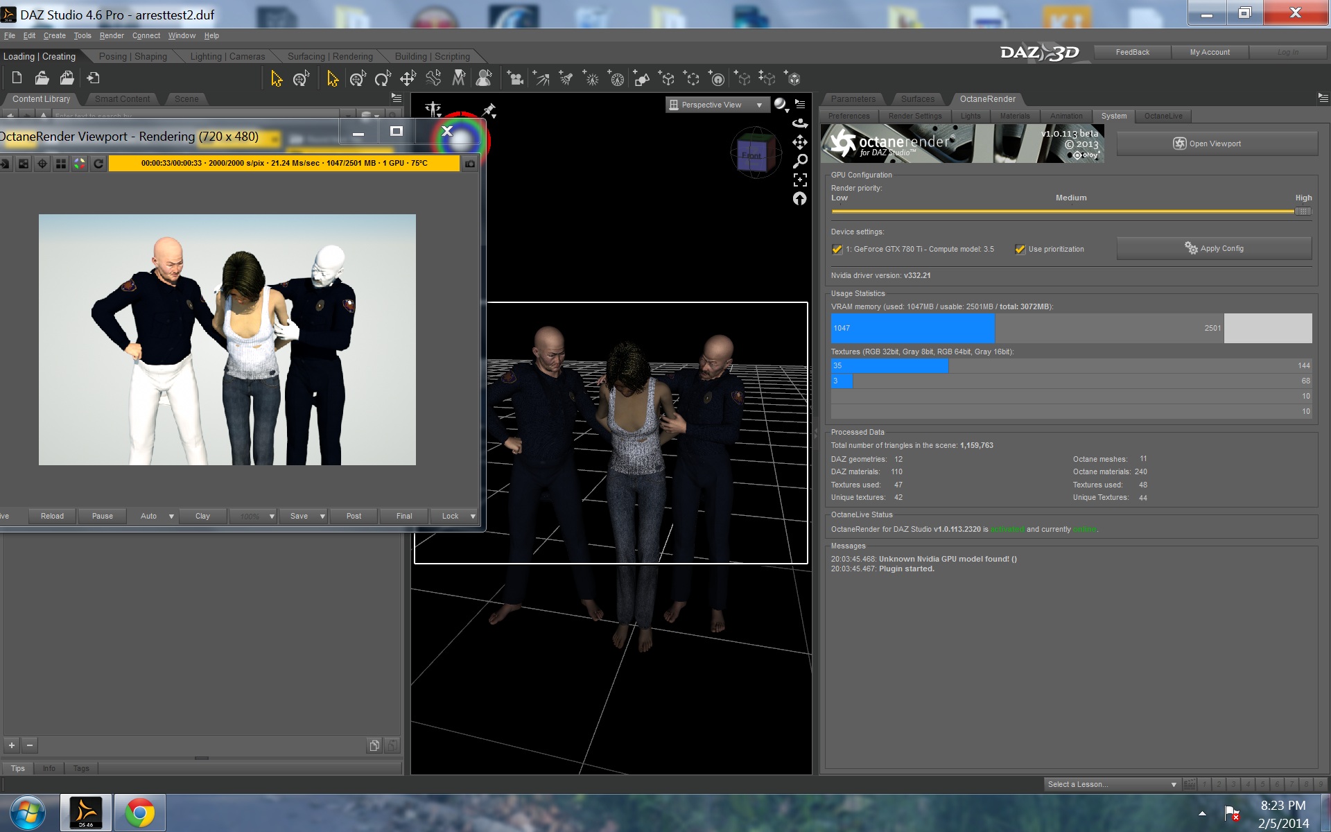 Thanks for the reply. I tried the method you suggested, and it only works on some parts of the characters. When i put one cop in the scene, everything shows up, but when i put the other cop in the scene the materials from the first cop disappears. The materials from the first cop gets unlinked in octanerender and the character doesn't show up in the objects list anymore. Every once in a while they'll both show up fine when i delete and re-add them to the scene, but when i move them around they loose their surfaces again.