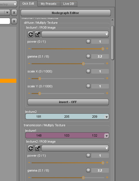 In some complex materials, when I change a certain map in one node (diffuse, bump etc.) it automatically changes in all nodes. I'm yet to determine what it's down to (it always happens with 3dmania's kindly shared SSS skin preset from another thread http://render.otoy.com/forum/viewtopic. ... 3&start=10). Breaking down the material in NGE doesn't seem to affect this issue.