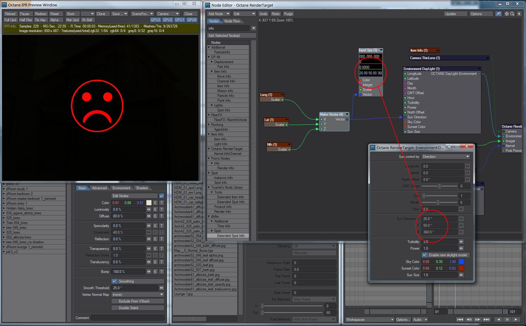 I wish to control the Sun Direction HPB values using input nodes driven by 'X' (in this case X=current render camera)
