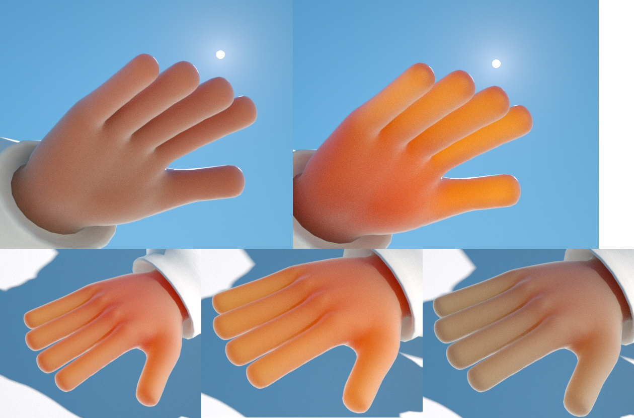 The tests don't currently use any maps on the hand and I tried different degrees of solid fill values either side of the scattering effect to see what maps could be authored to blend between for the result needed (plus bump/normal/roughness maps eventually with possibly some falloff maps effecting sheen).