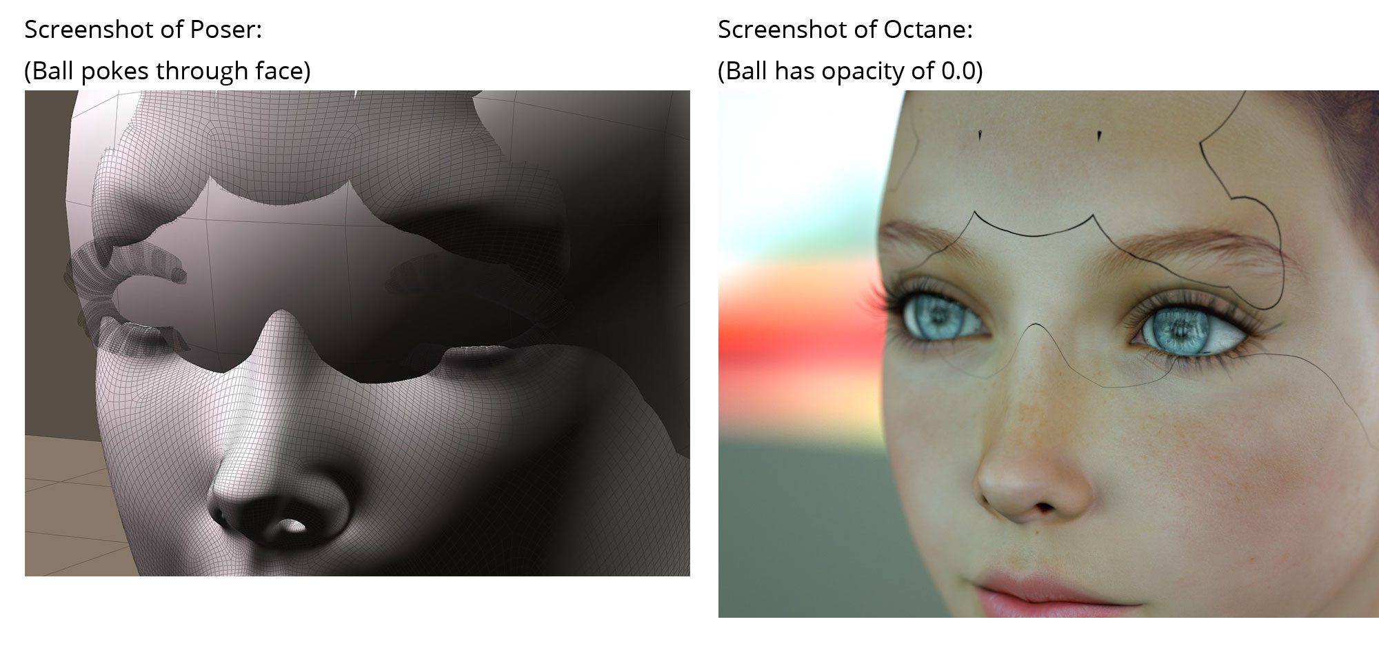 Load any character in Poser . In my example it's one of my V4 characters. Then create a ball prop and place it anywhere (in my example in the face) and let it poke through. Then set it's opacity to 0.0 in octane. I would expect the ball to be completely invisible but take a look what happens:
