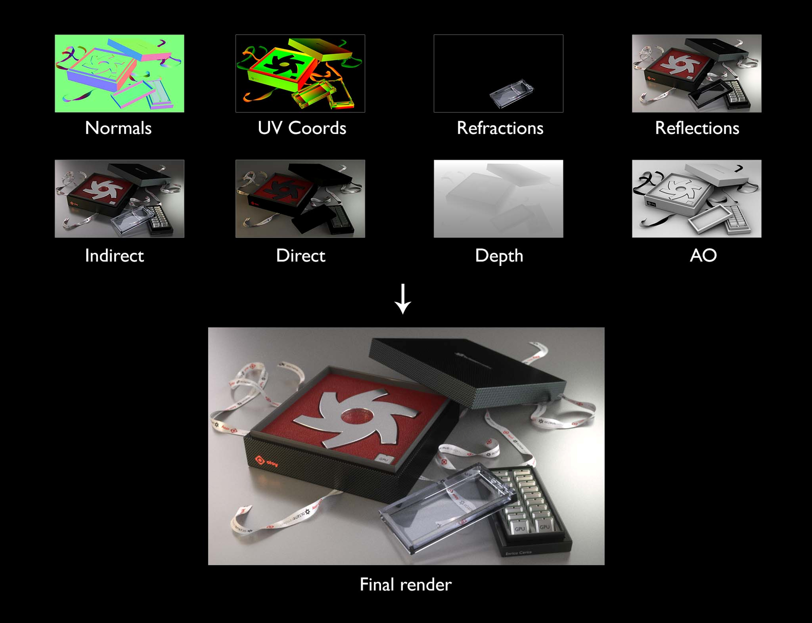 image such as reflections, refractions, normal, direct and indirect lighting, among others.