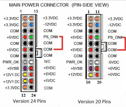 To test or use the PSU separately from the motherboard, you have to put in contact together the Green wire of the 20/24 Pins ATX plug with the Black wire which is immediately close to the green wire. I have just watched the plug of a recently dead PSU I have still here, and there is a black wire on each side of the Green one. As all black wires are 0V Common wires, each of the two should do the trick.