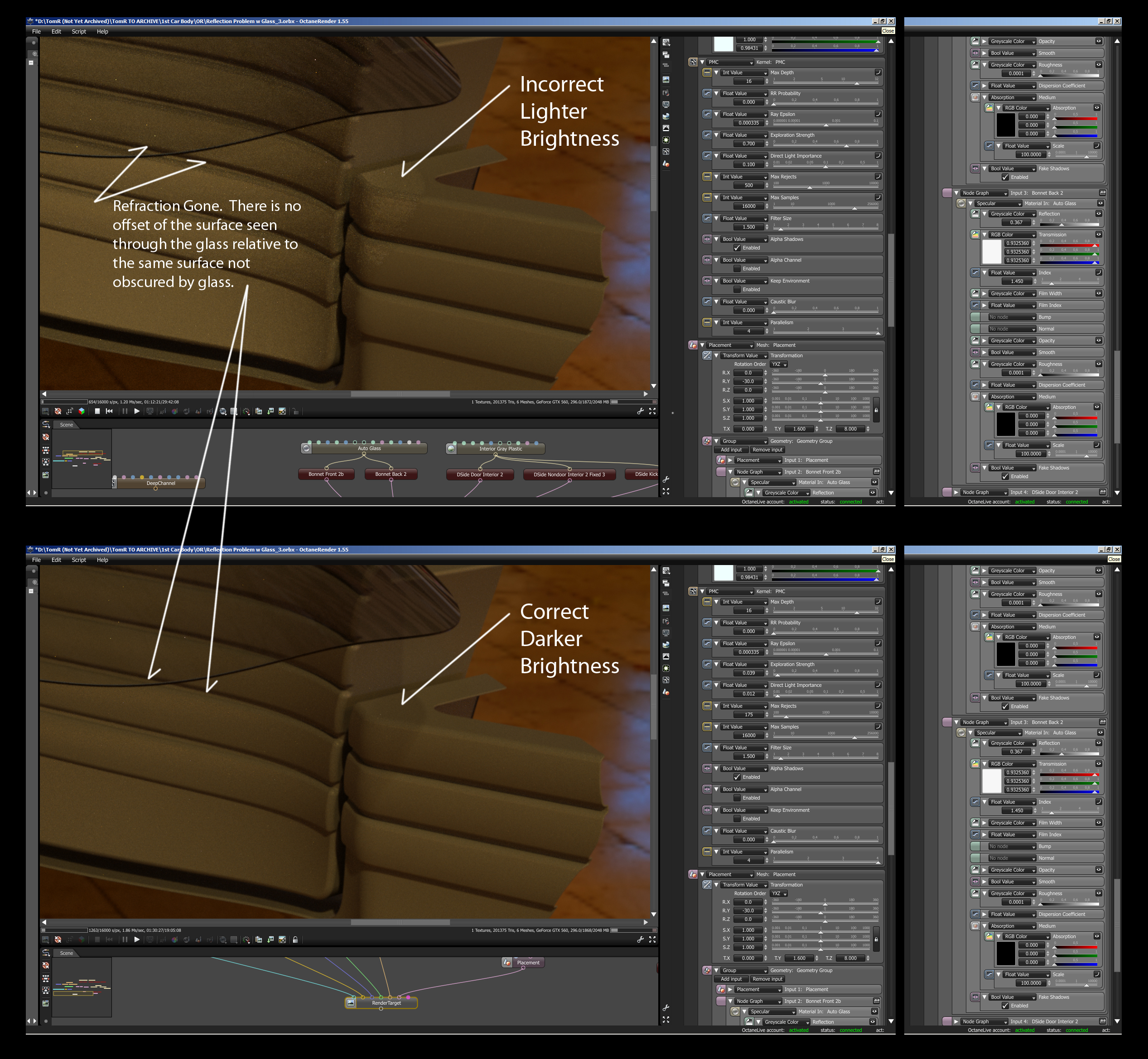 BUT, what happened to refraction?! I think this is a totally unrelated problem. If you look closely at either image, there is no offset image of the underlying surfaces seen through the glass. It is as if IOR is set to "1". In both images, the Index is set to 1.45, plenty to create the expected offset. Look along the glass edge and there is no refraction bending at all. I don't think this is an Octane problem, but I'll be damned if I can figure out what it is. No matter if Fake Shadows/Alpha Shadows is on or not, refraction is zero. Also, I have checked the surface normals and they are fine...pointing away from the glass surface on both sides. What the heck?!