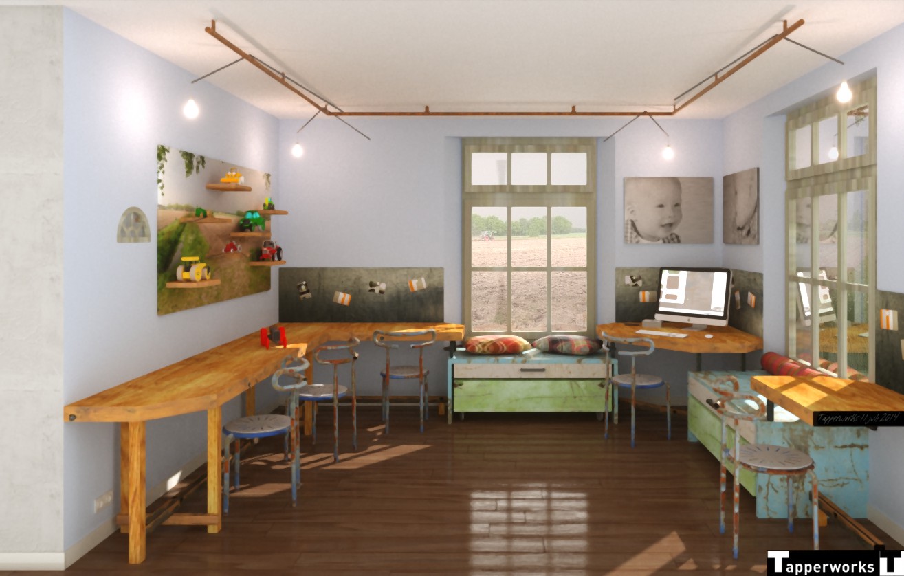 I did not get too much light in the room and therefor I added a vertical emitter plane just in front of the cam and clipped the camera (nearclipdepth); also to get a good view in the room by clipping the wall. Later on I added the ceiling lights for accent lighting.