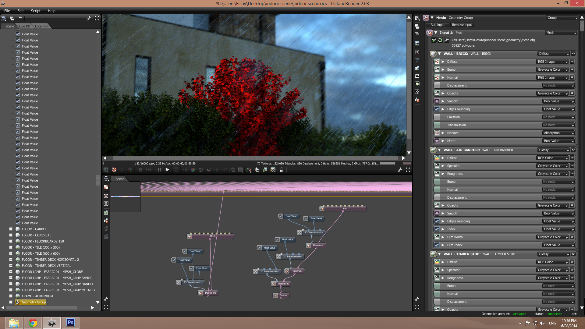 On another topic Paul. When exporting a scene to an ocs file and opening it in the octane standalone, the complexity of the node system created is so great that my octane responds so slow to the point that it is unusable. After separating one of the paths (a tree) and seeing how it has been structured, it seems that is overly complicated in the amount of nodes needed to create the same result. (see attached images, I have made the obj model red for clarity). This tree is one that was being proxied within the revit plugin. Would it be possible to eliminate the excessive transformation and placement nodes during the creating of the ocs? and also the scatter node. As it seems redundant aswell. This proxy wasn't being scattered. And finally, this tree was used multiple times within the project at different scales and rotations, (that I manually entered when assigning the proxy). Rather than have duplicate obj nodes created and then each having their own separate placement node. Can each of the placement nodes simply be connected to the one obj. This would speed up the interface dramatically, and make replacing or editing in the standalone actually possible.