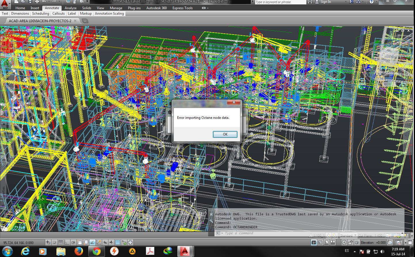 AutoCAD2014 error - this means there was an error loading in an Octane material (I suspect AutoCAD is corrupting the plugin memory space of the dwg file - but I cannot be sure since I've only seen it once before (which was the file you previously sent me). If you save and then reload the file, it should load correctly (although the custom Octane materials will have returned to their default, since they couldn't be loaded when the error occurred).