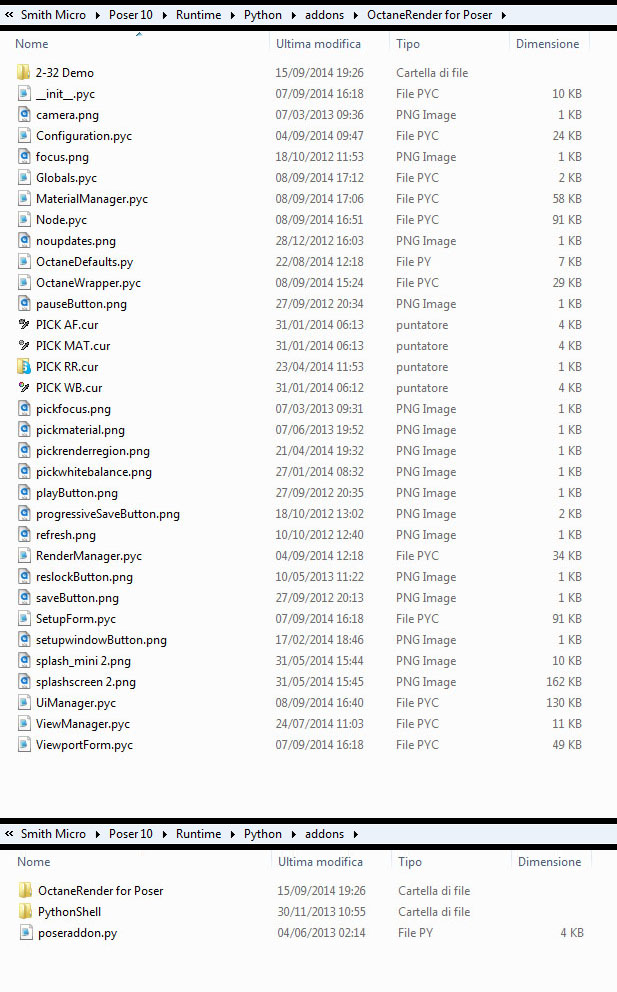 2) Can you pls post a screenshot of your C:\Program Files (x86)\Smith Micro\Poser10\Runtime\Python\addons\OctaneRender for Poser folder.