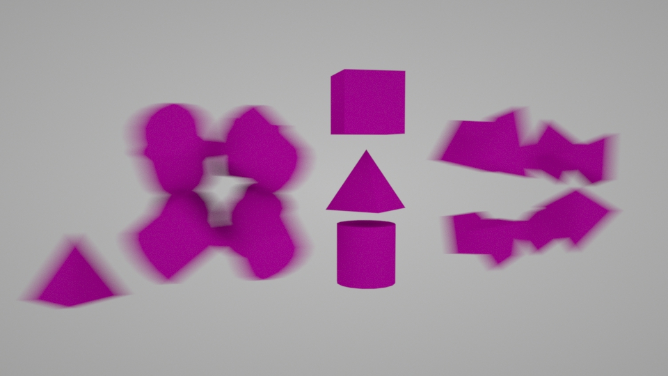 Now I have parented the camera to the moving Null. In relation to the objects the camera should have a locked position, which is true for the three objects in the middle, but not for the instances, which are now blured. Bad behavior, bad.