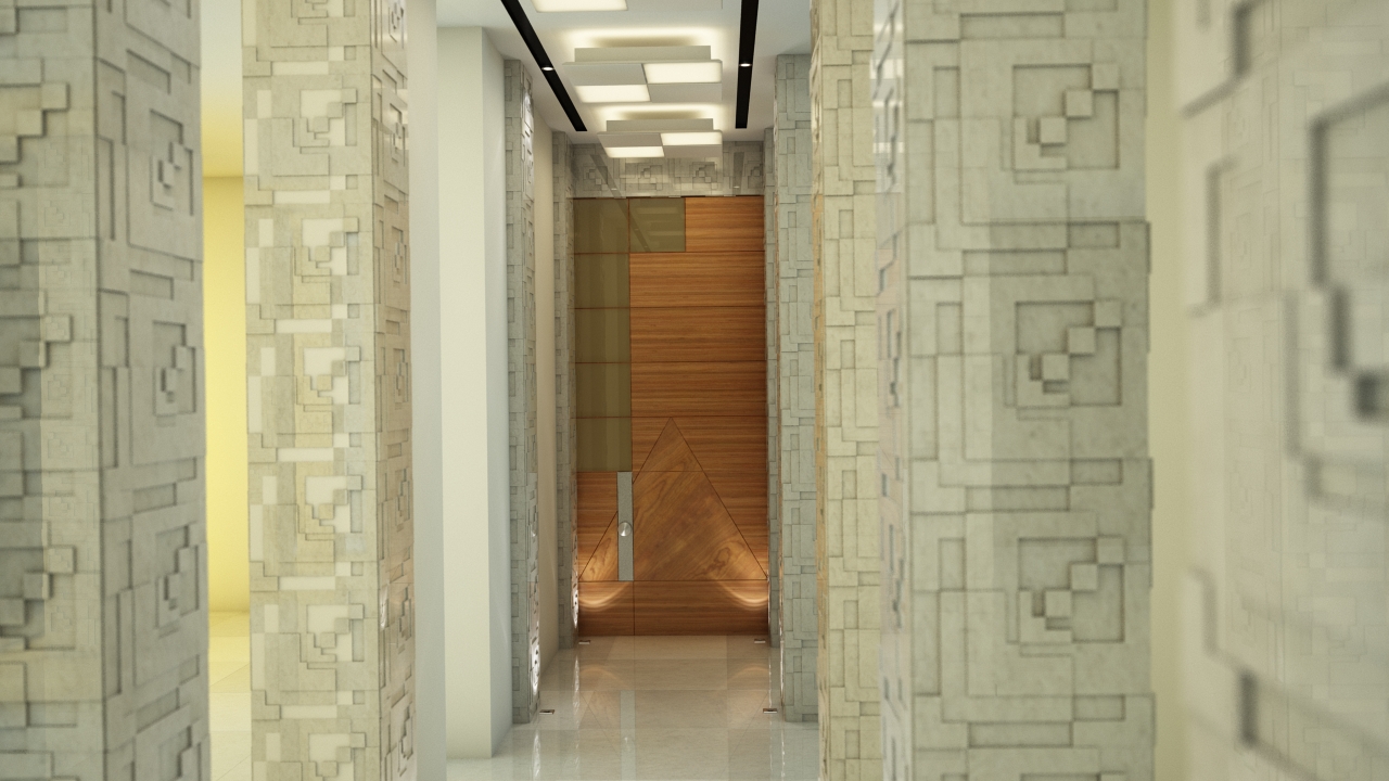 A tour around the showrooms of Ennis house (Frank Lloyd Wright). In 3d. Carrara scene.