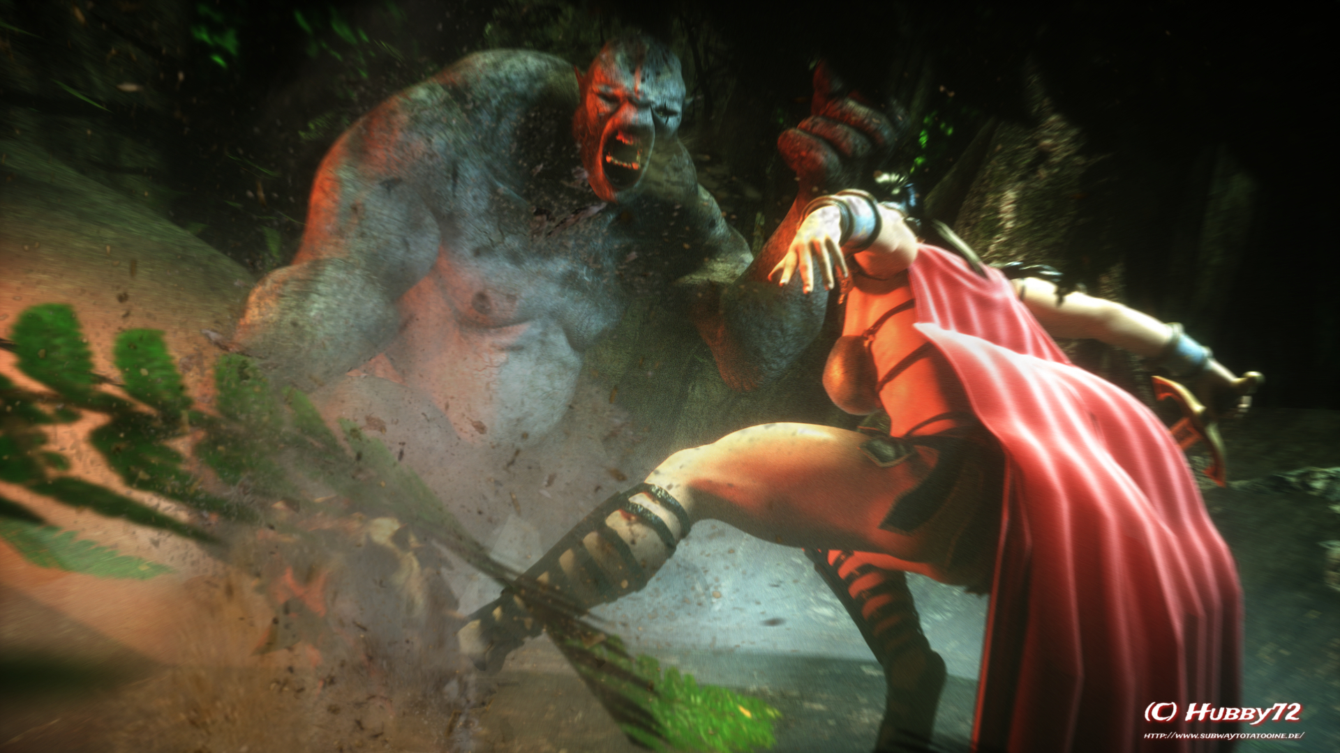 She is facing a troll in a one on one duell. And as he smashes down his club she quickly jumps back. She is quite too fast for him.