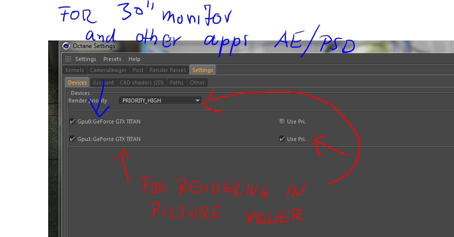 Miohn, basically, if you uncheck "use Pri." on your card NOT running your OS and monitors, it will run at full, maximum speed in Octane. Check the "use Pri." for your other card and set the priority dropdown to low or medium so you can use other programs. If you have it setup that way and your OS is lagging horribly, then you need to reverse the settings in Octane and uncheck "Use Pri." for the other card and check it for the one that was running maximum. You're probably right, it may be useful to have priorities separated for both, but people who run multiple GPUs tend to not use priority for the secondary so that it is always running at maximum.