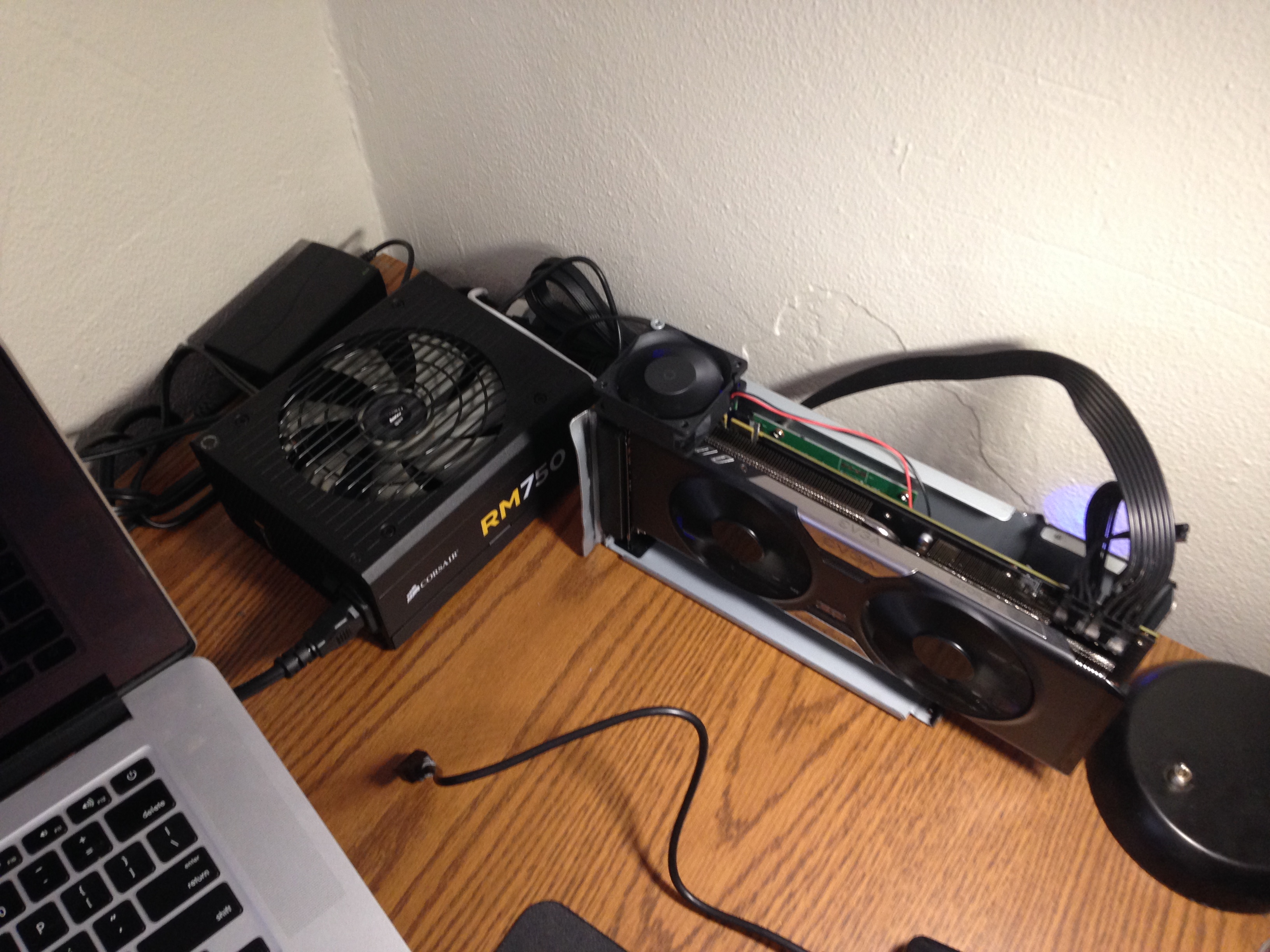 Incase there is future interest in this, here is a photo of my GTX 780 eGPU Macbook Retina build. I just got her running today. Setup was surprisingly simple and I haven't come across any cons to this setup. Once the drivers are installed, it is essentially plug-and-play operation.