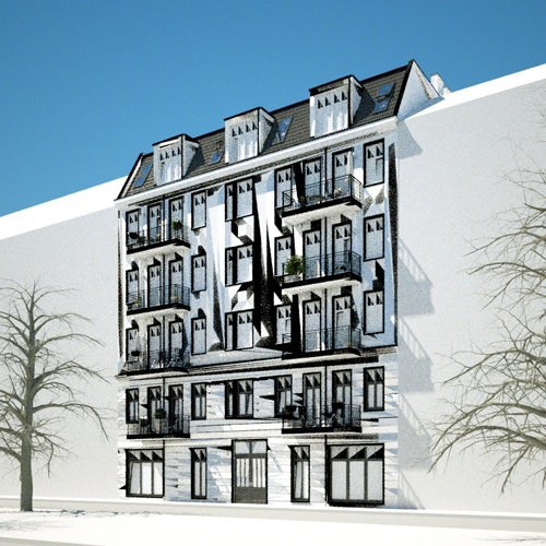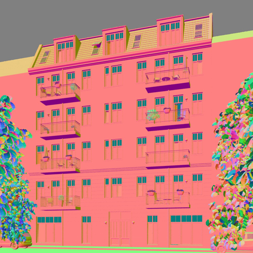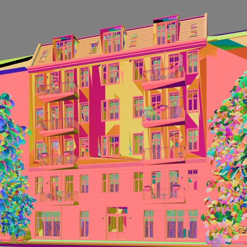 Then I found out that the error changes with making or unmaking things movable proxies. I attached another picture ("unmade proxies") to show you that the materials shown in the rendering for the front of the house and the windows are now shown differently after I unmade the belongig objects movable proxies (rest of the scene are still proxies and I also need most of them to be). I attached another two pics to show this: "04_unmade proxies" and "05_unmade proxies_shading normals".