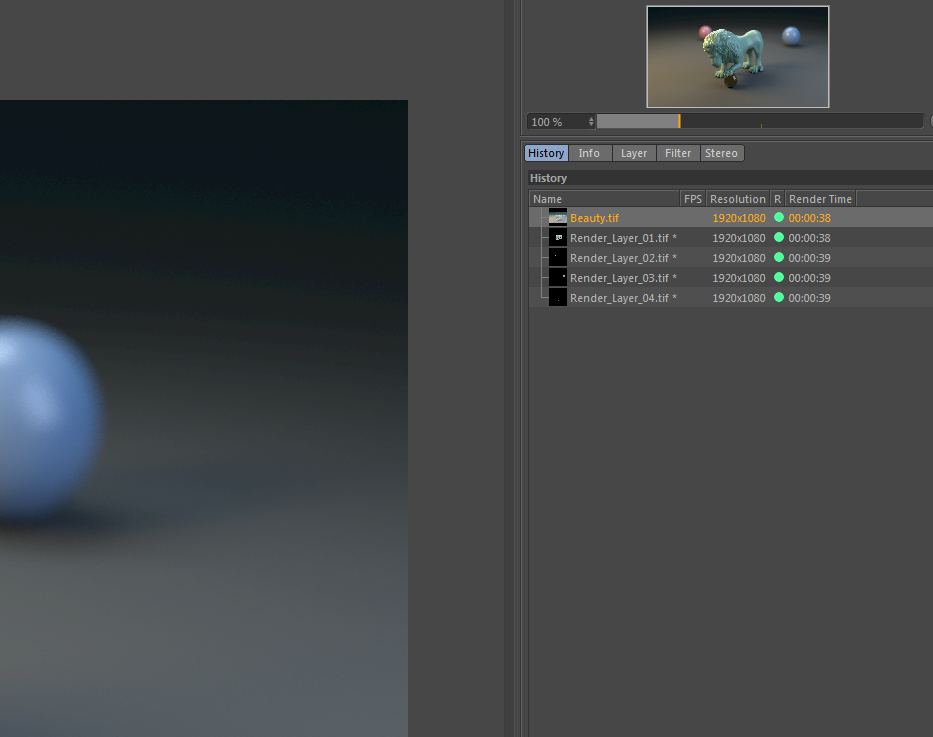 The first file rendered is a flat beauty image. Then that very same composition is broken down to layers by using the render layer system.