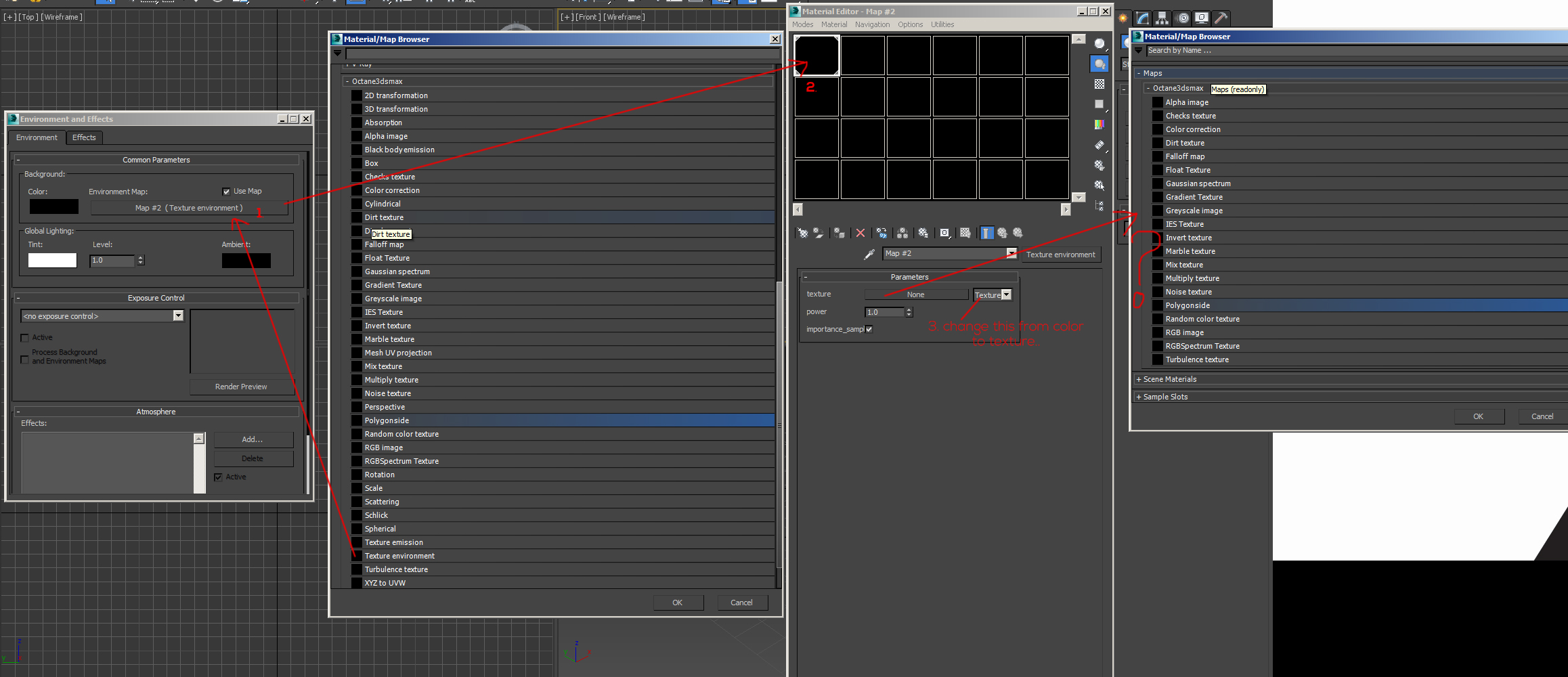 press 8 > hook up texture environment > drag to mat editor > hook up Image texture.