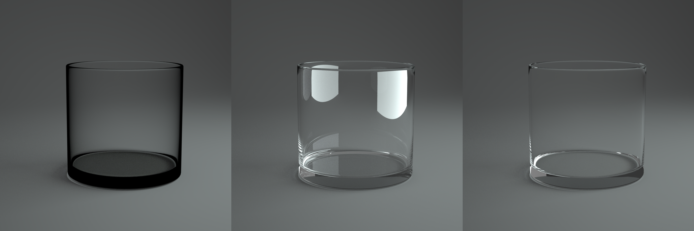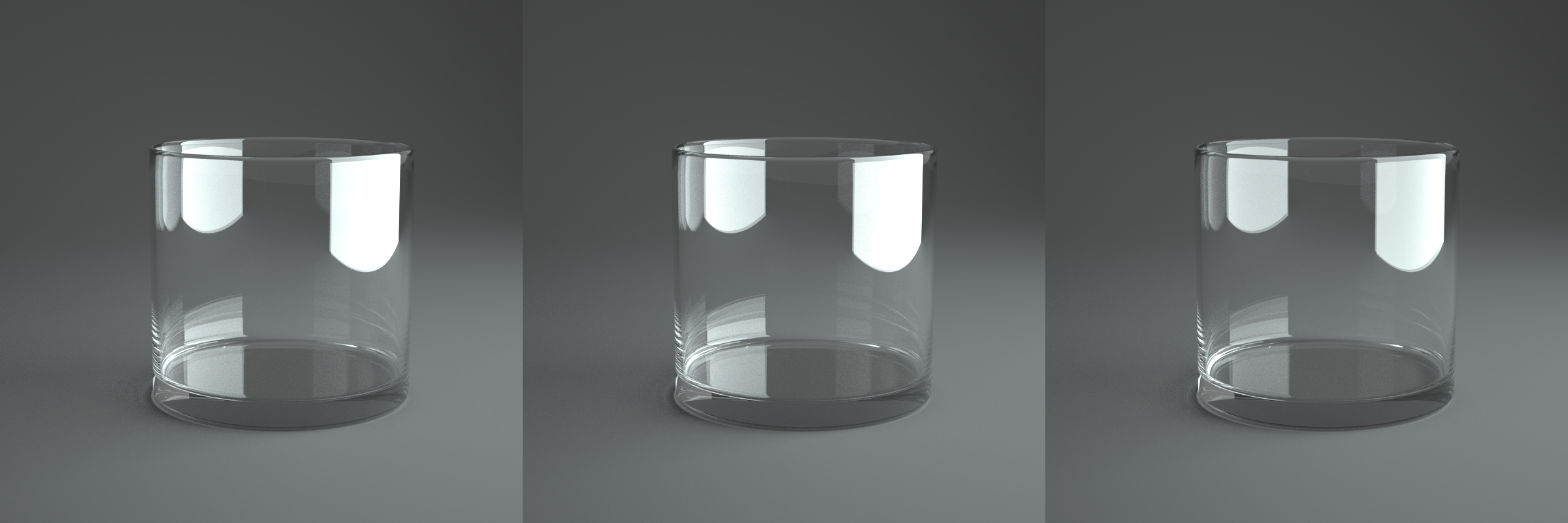Ok, I have been fiddling around with the specular material trying to improve things. Turns out, that the Fresnel reflection that is being calculated is too bright. It is like all light is polarized perpendicular to the reflection plane (in reality it's usually a mix). I fixed that and also tried to improve the internal reflections. Tell me what you think (the left glass is rendered with 2.21.1, the center glass with 2.22 and the right glass with the (hopefully) improved specular material):