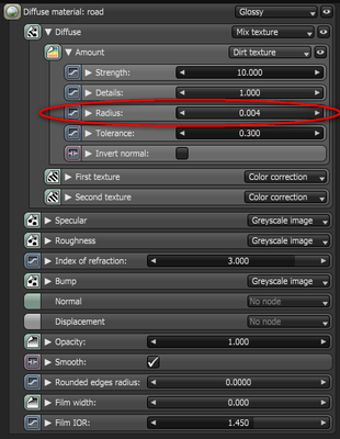 2.21.1: 2.22: I'm not sure what you want to achieve, but as I said before, the dirt radius is too small. The teapot is about 2m in size and you have set the radius to 4mm: If you set the radius to 1m, you see an effect on the road: