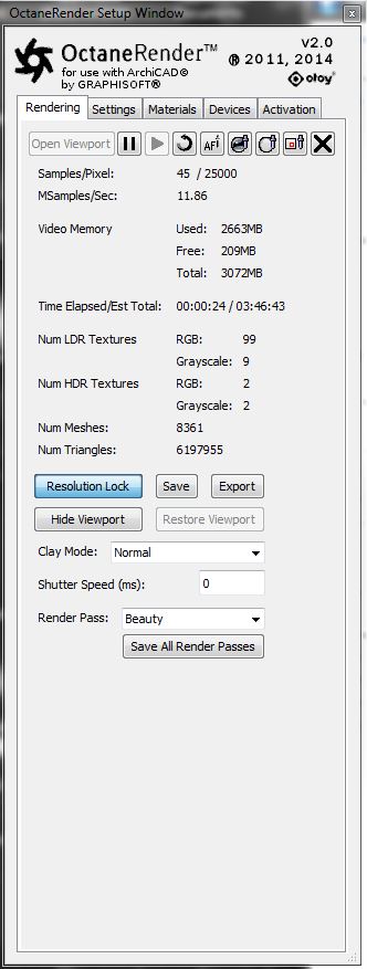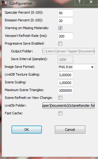 When checked, you CANNOT render via the Octane Photorenderer UNLESS the Octane Viewport is already open, however starting the plugin and loading the OctaneRender Viewport is quicker. If you add anything to the ArchiCAD scene when the Setup window is open, you should close and reopen the plugin. Pen materials are not processed when Fast Cache is enabled. Restart the plugin after changing this setting.