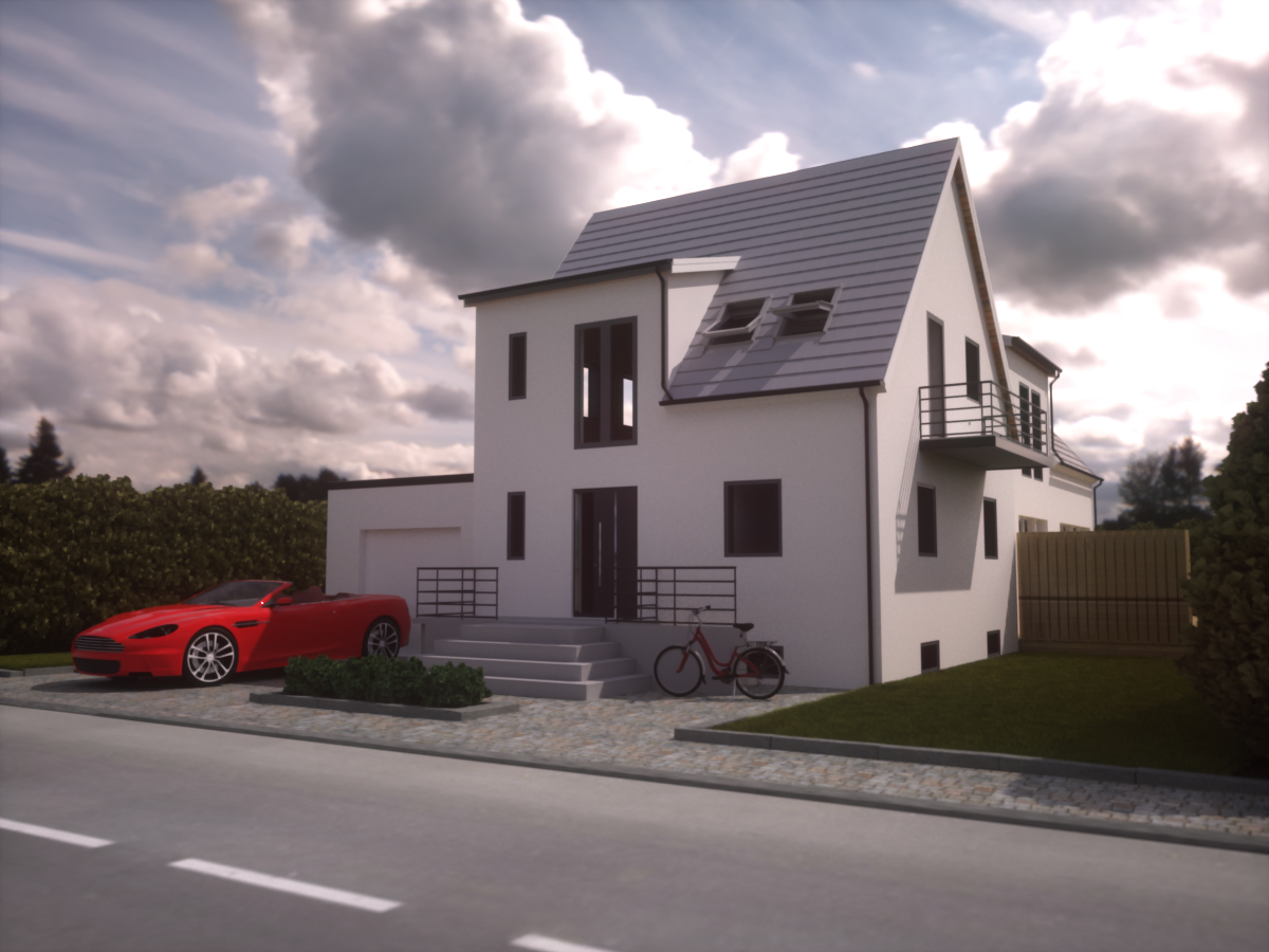 rappet wrote:I would like to suggest to try camera on eye level (i.e. 1.65m) and show more sky above the building to get more natural camera feeling and better layout. Show more of the side of the house might improve the image too.