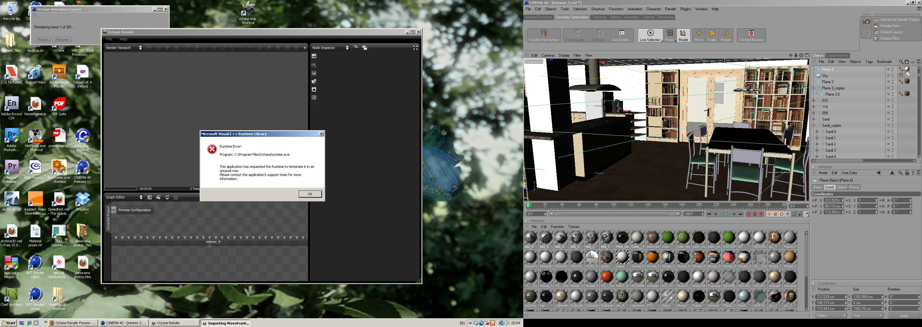 Windows 7 , 64 b / GTX 590 / Archicad 15 , 64 b / Cinema 4D R 13 studio , 64b /Intel(R)Core(TM)Extreme3,20Ghz /always latest Octane.