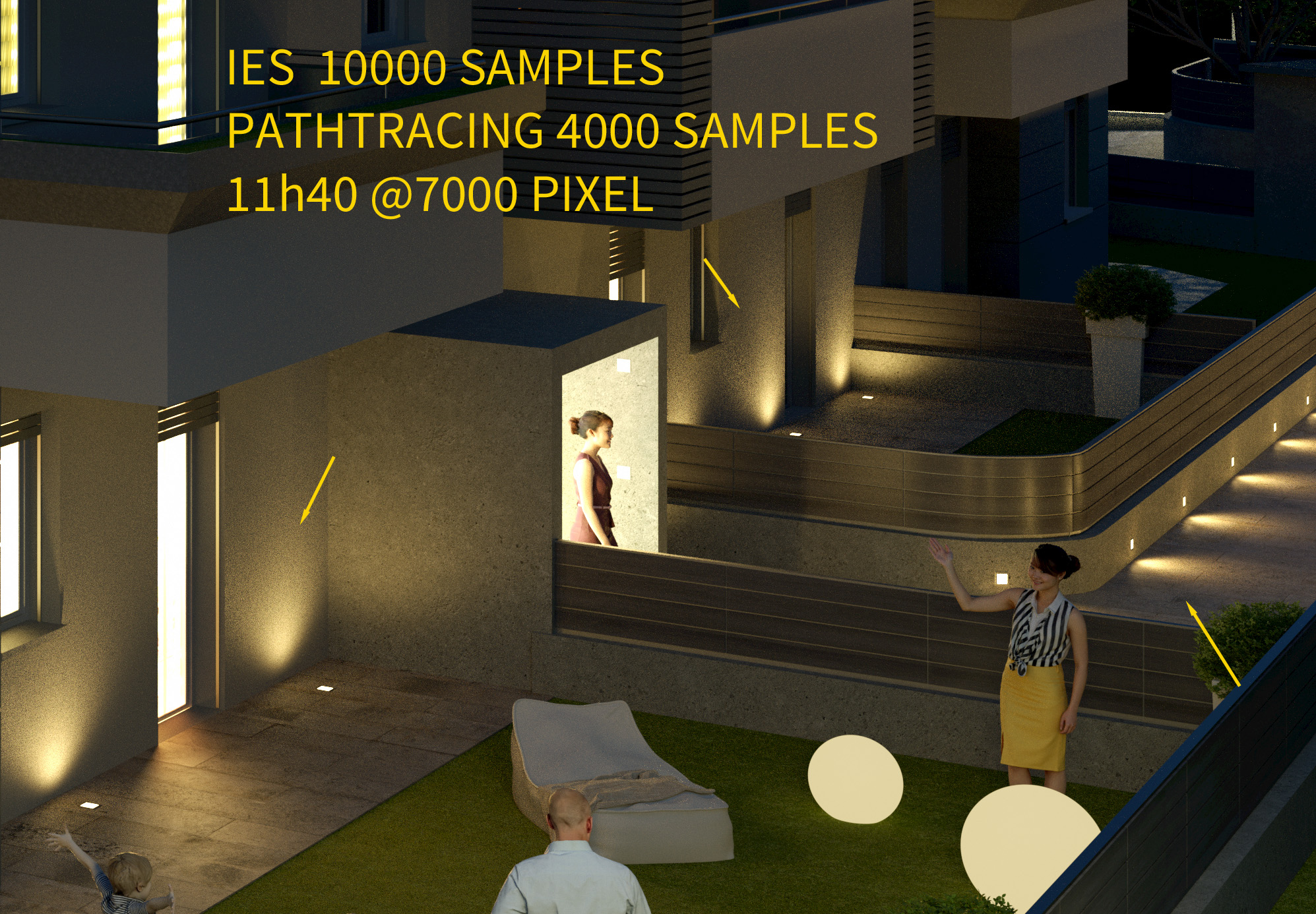 In the image "test B" I've setted the IES to 10000 samples, and rendering the scene at 3500 pixel, pathtracing, 8000 samples.