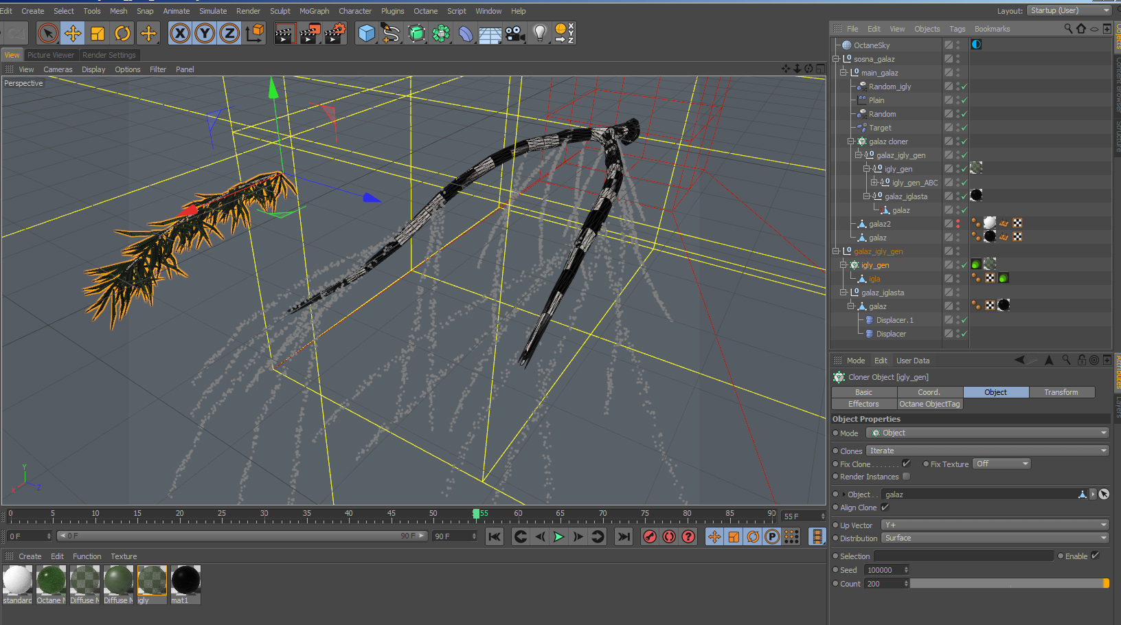 As for the render times i did not go above 2 hour / frame for any of the shots. For the waterfall all the needles were rendered as geometry with glossy refraction and pathtracing was used for rendering, it took about 1 hour / frame on 2x 780ti. That was the biggest scene for rendering and one of the hardest ones to animate.