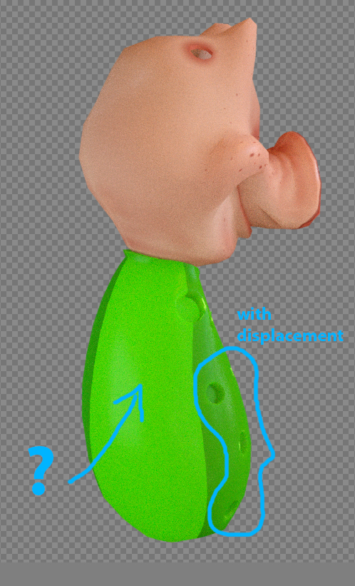 I've a problem using displacement and SSS at the same time : when I switch on the Displacement ( in the mix material containing a diffuse one and a 'spécular' one ) , then the SSS on my diffuse material seems bugging : you can see on the images above , that when Displ is on , the SSS is badly calculated and gives strange results . Is there something to do to fix this , maybe I made something wrong ?