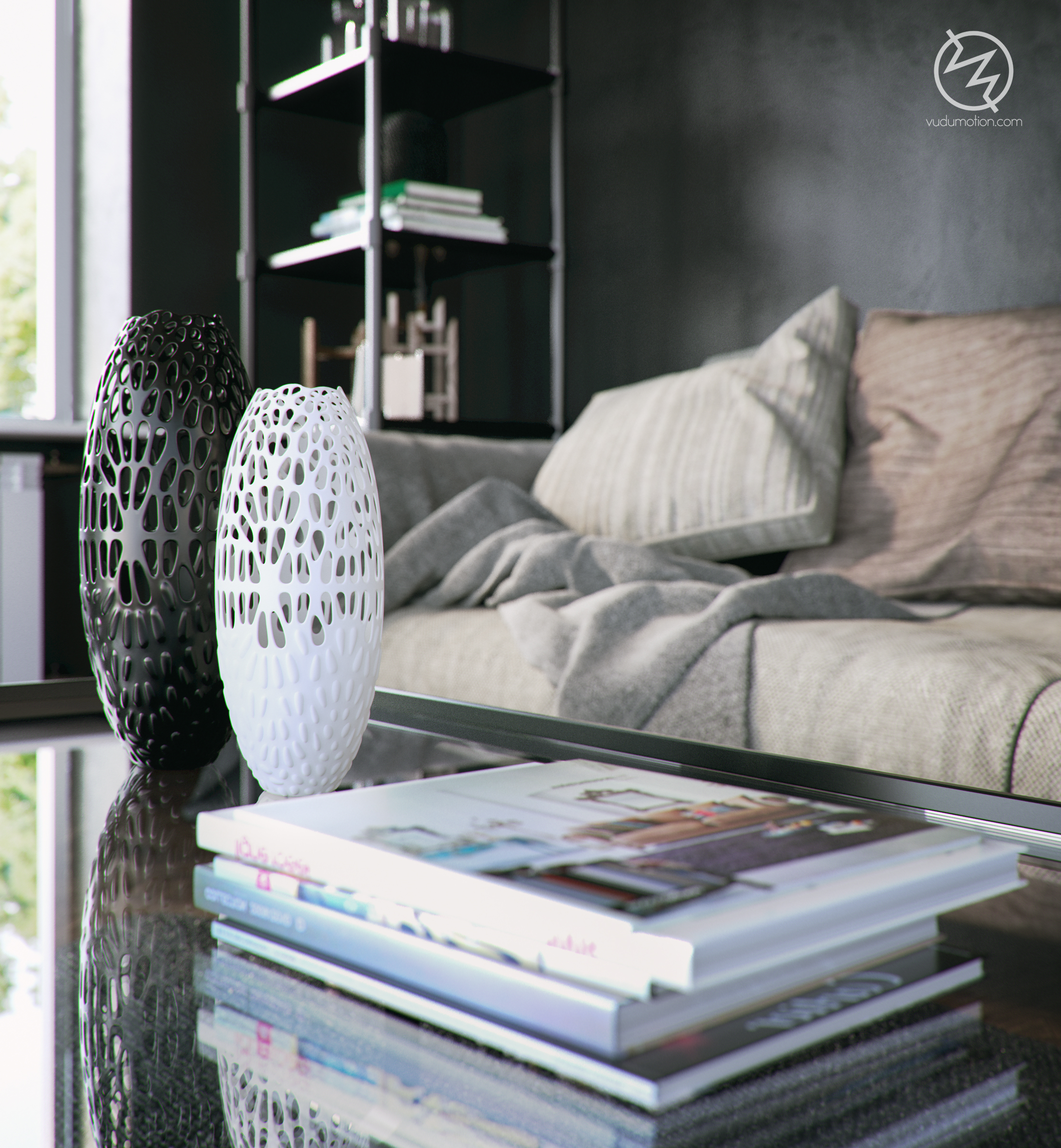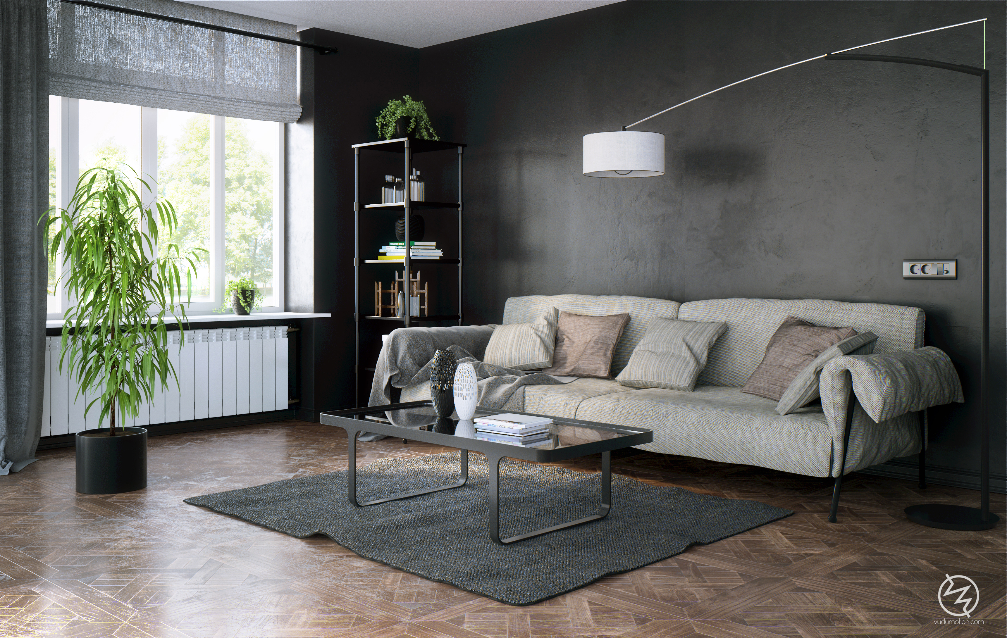 After creating a couple of very bright interiors I decided to do the opposite. Well the room is still bright but the walls are black.