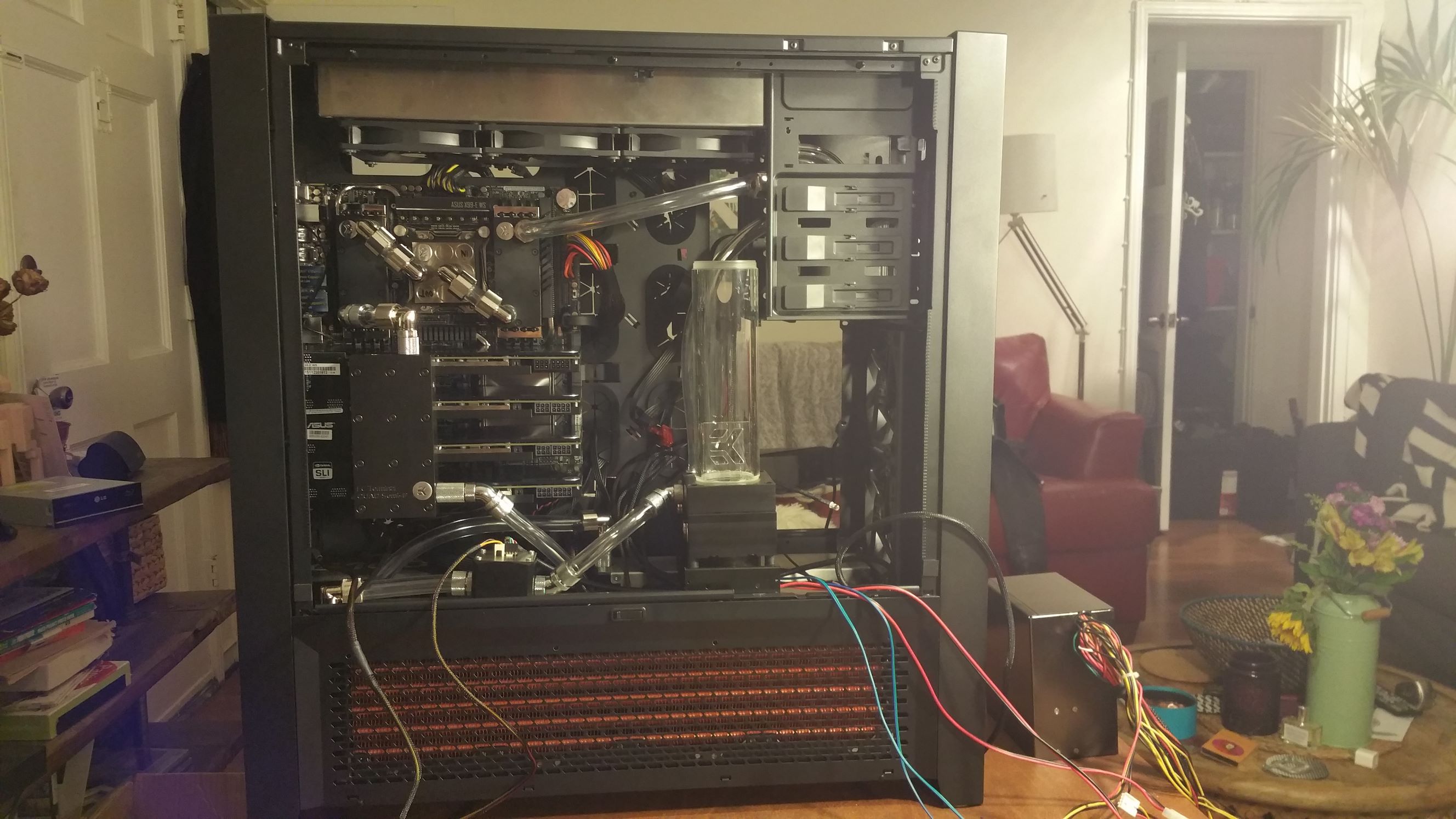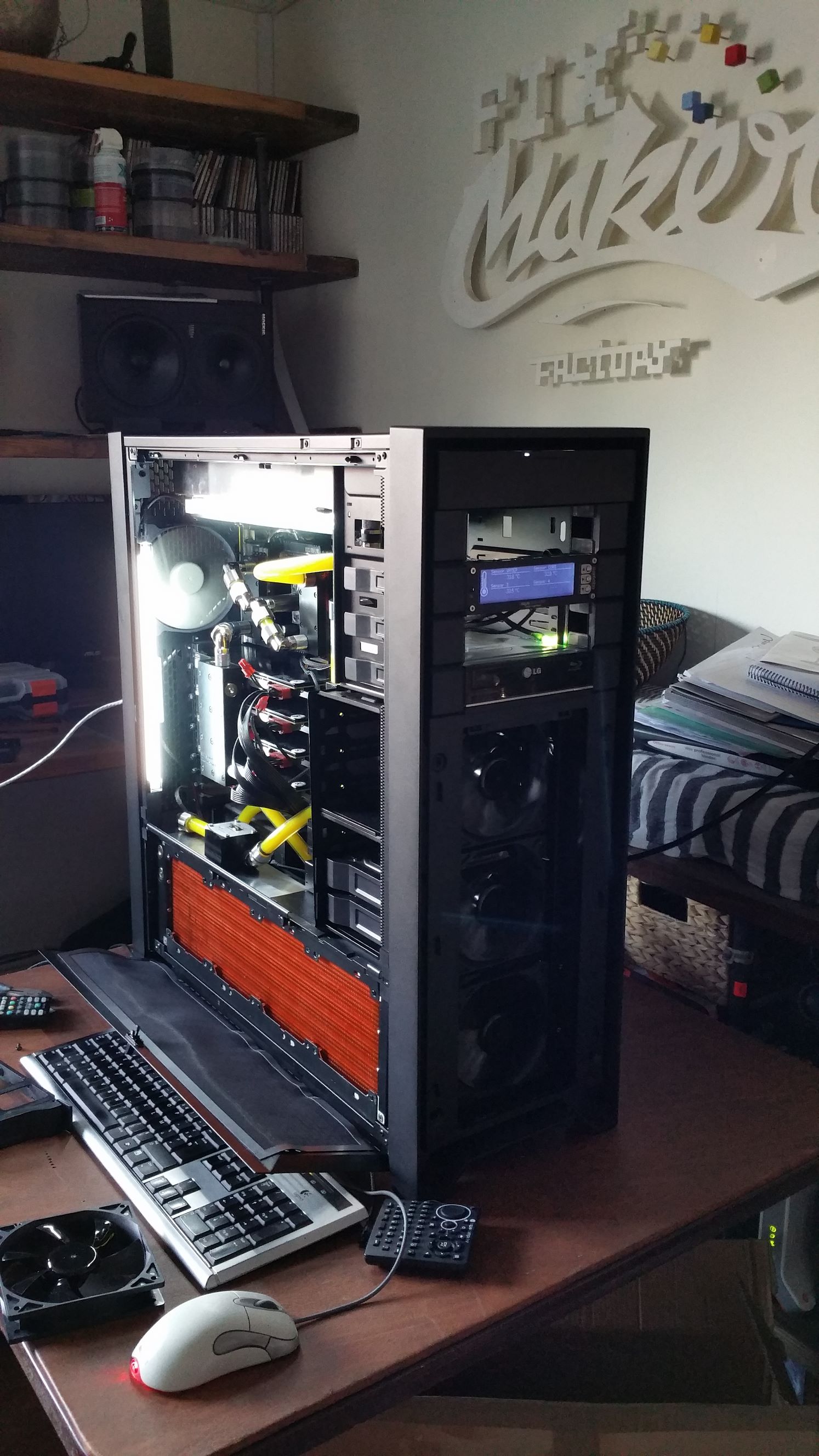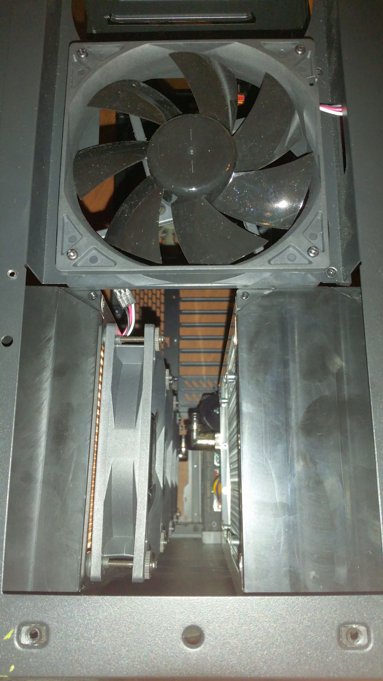Here is the actual system If I'm not mistaken, you are telling me that, in the lower chamber, I should be pushing air from outside the case, trough the radiators, on both 480 and 240, right? So all the hot air would then be created from the bottom (with 480 pushing air against 240), then the hot air would come up inside the tower, then would be distributed to the exaust fan at the top rear, and the 360's fan top, right?