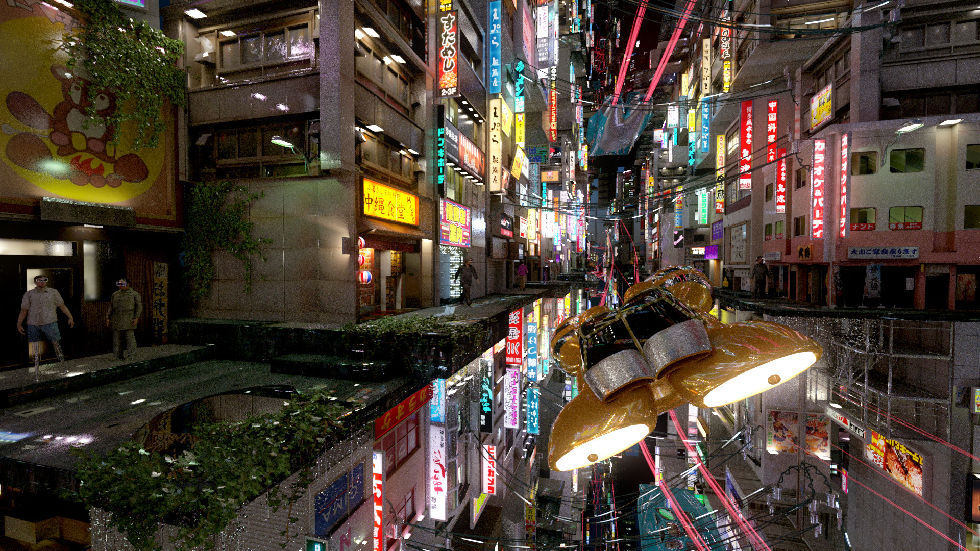 When in Tokyo, I wanted the cascades of Neon lights to never end and extend in all directions. So I shot lots of Photos in Shinjuku district of Tokyo and modeled the streets to be endless. The scene then escalated into a Future Version of Tokyo, at the 6-way crossing between Red Light district and Shopping district, with view to the tiny floating park and the business district as well as futuristic transportation concepts. Also, in the future in Tokyo, everybody wears some strange glasses… are those for VR?