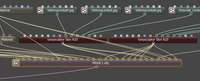 I just used the "Tonysculptor Skin R20". I am getting really good results but you still need to tweak it. The way I am using it is I connect the "Tonysculptor Skin R20" to the imported object and then attach the texture / bump as needed to it. I am attaching a partial screen shot to show how I have it connected.