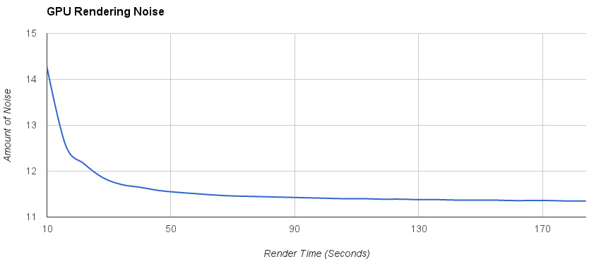 This is the graph I found where they said after 1 minute of rendering GPU noise goes away very slow so 2 minute of rendering will looks as good as 5 minutes of rendering