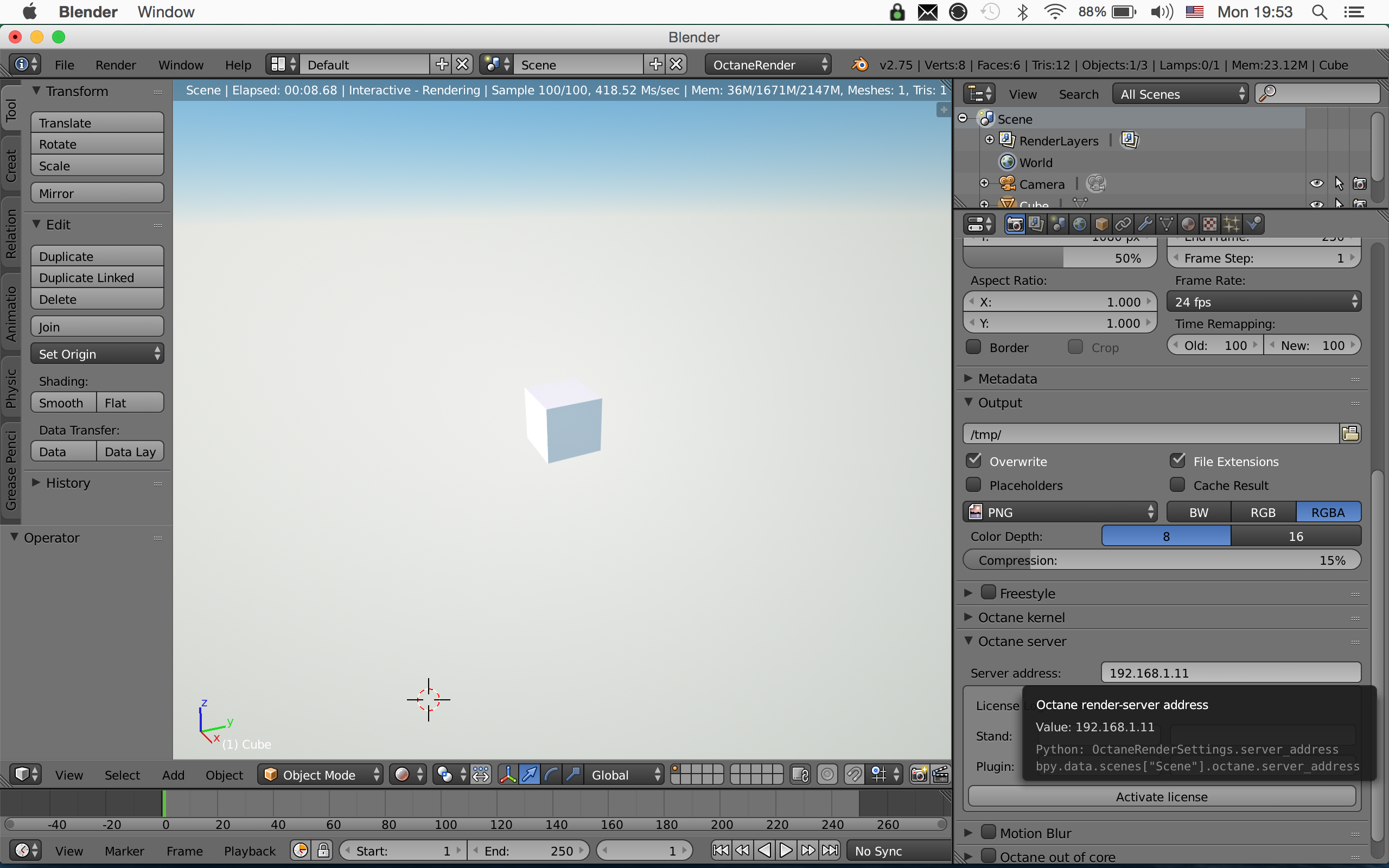 After the server is run - you can start rendering (or open a rendered view) from inside Blender. Before the very first rendering you should fill in the server address (only 127.0.0.1 at the time), login and password (your license key info) to activate the server. After the first rendering the server will remember this activation info, and you will not need to enter it again.