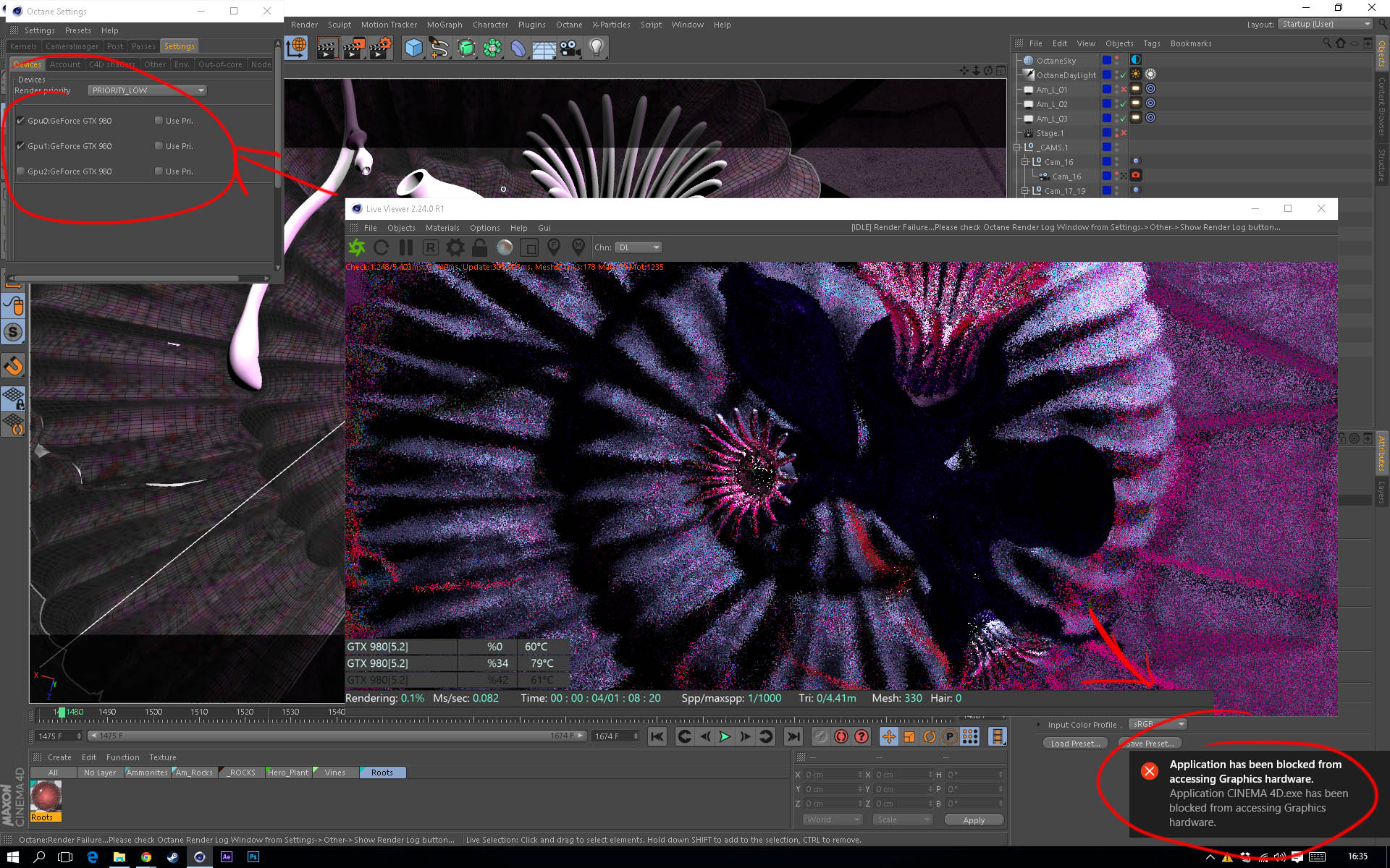 If I only use two cards the problem doesn't seem to occur when using C4D picture viewer but it does occur when using the live viewer and I get this windows message (bottom right). After this message appears the viewer becomes inactive: