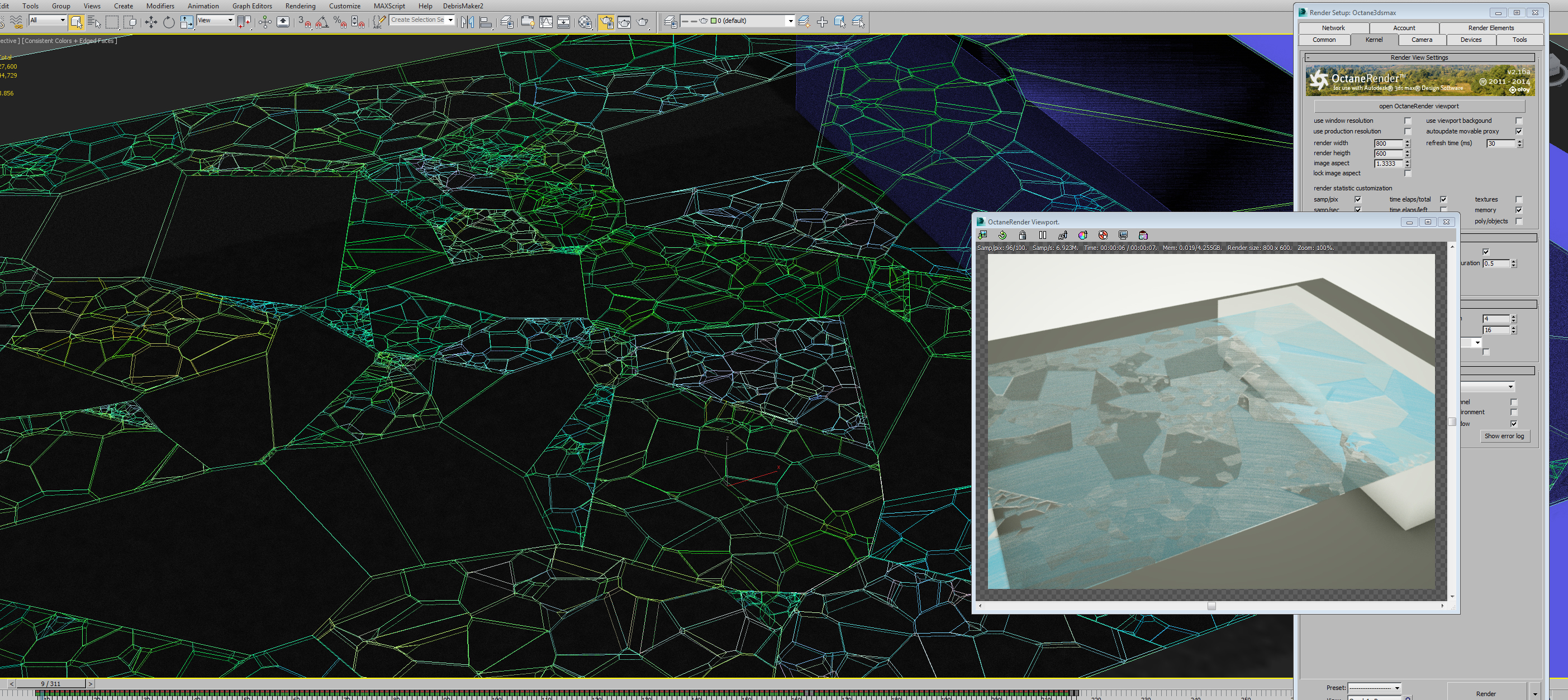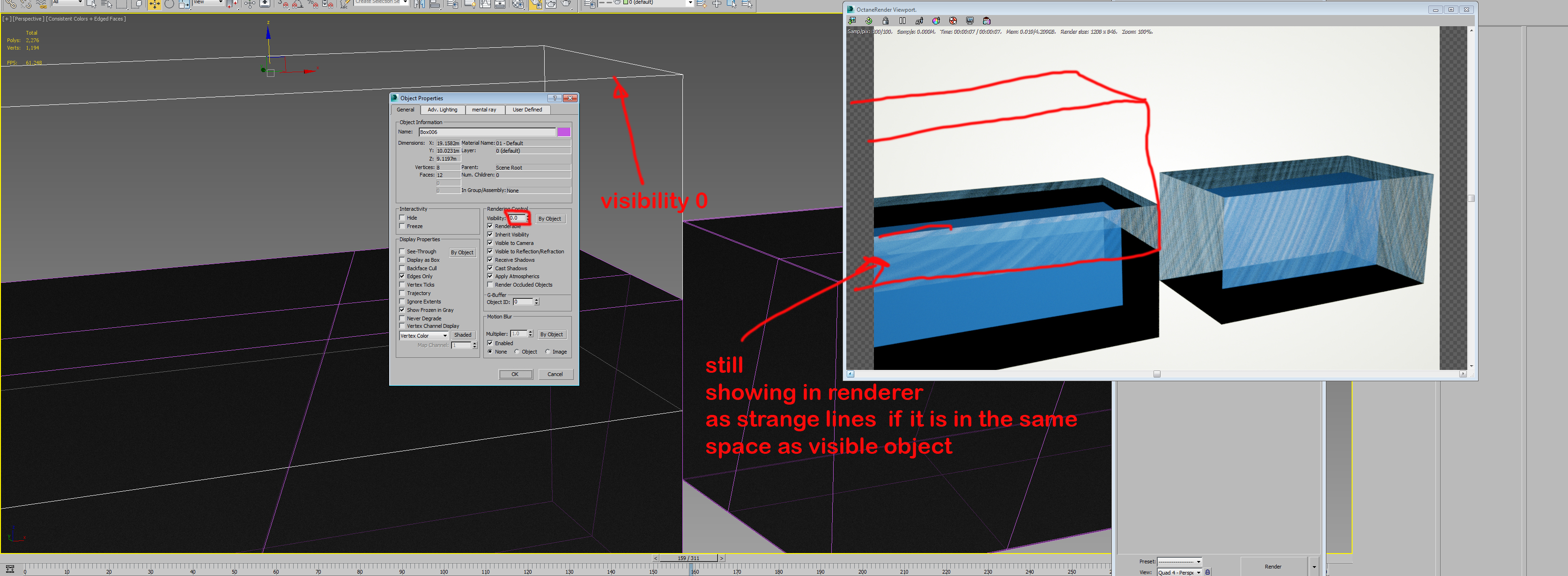 Hi If you make a box with glass material and clone it and turn one of the boxes visibility 0 It is like still there during rendering if it is located in exact the same place as a visible box. This is a problem for rayfire glass demolition since prefragmented glass is invisible until rock hits it but since it is located in the same space as glass before impact octane renders artifact lines. Please take a lot this bug Thanks