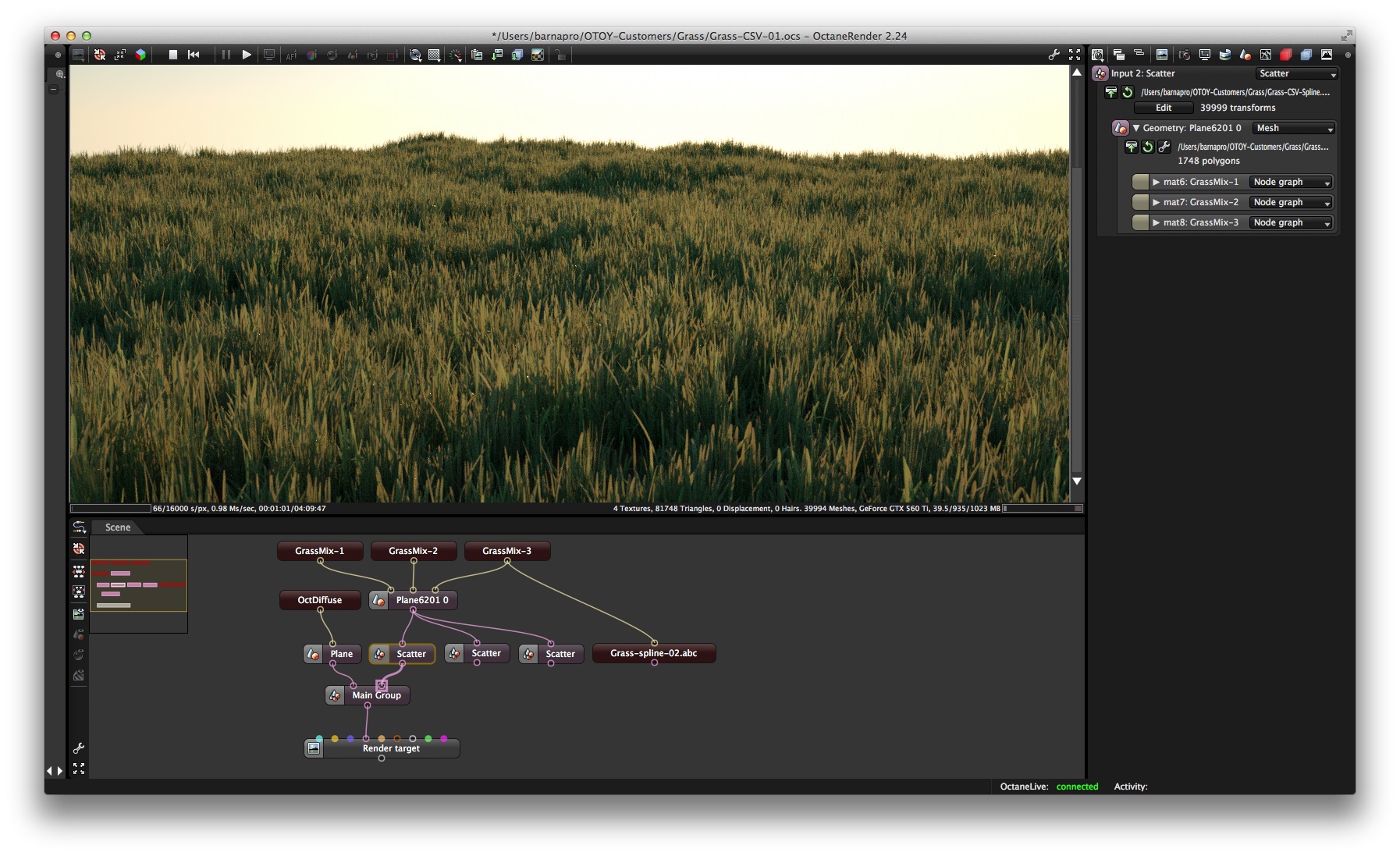 Octane 3 - Nodes Hair and Grass to create instances.