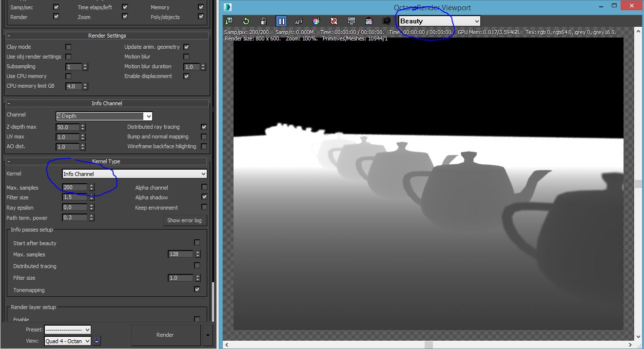 Actually if I go to the info channel and set the Zdepth max value and if I render using the info channel kernel, I get the right zdepth in the image as the Beauty Pass (see image) but if I change to the PT kernel again, it renders as shown before (see image) even though the max value is set. So I'm confused about the passes being shown in the virtual frame buffer when you render with the right kernel type. I thought that the passes were shown in the same window when you render and it was just a matter of dropping down the menu.