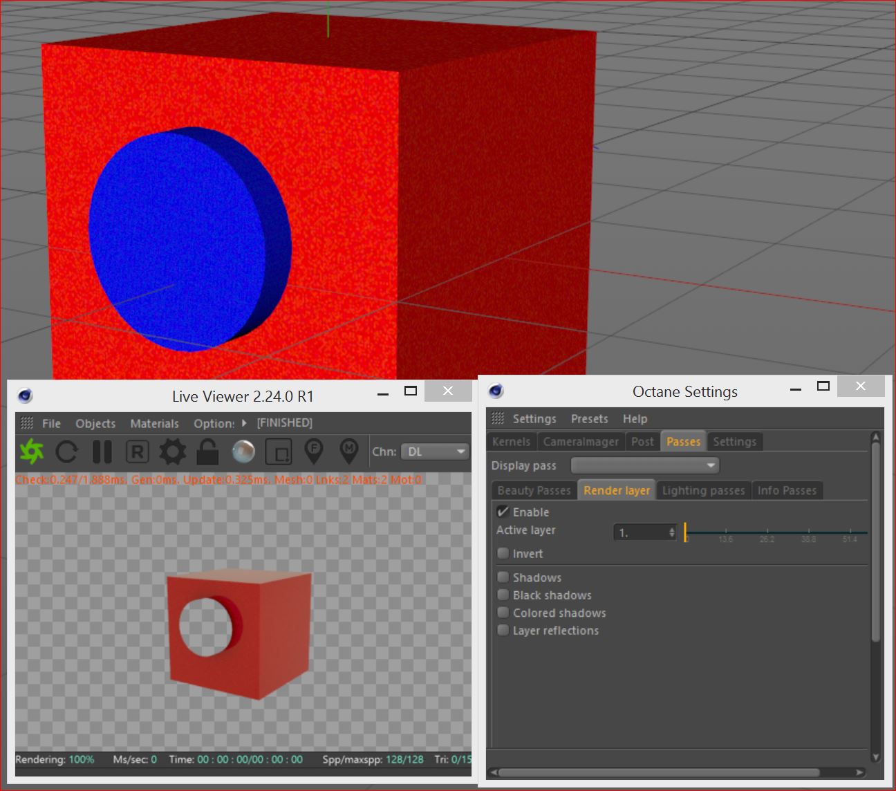 use a Octane object tag for the two objects, one for layer ID 1 and the other for Layer ID 2, then on Octane setting go to Passes > Layer and select Enable, you can obtain what you need in two ways, move the cursor Active Layer from 1 to 2 and see the result il LV. Or select simply Invert.