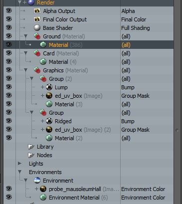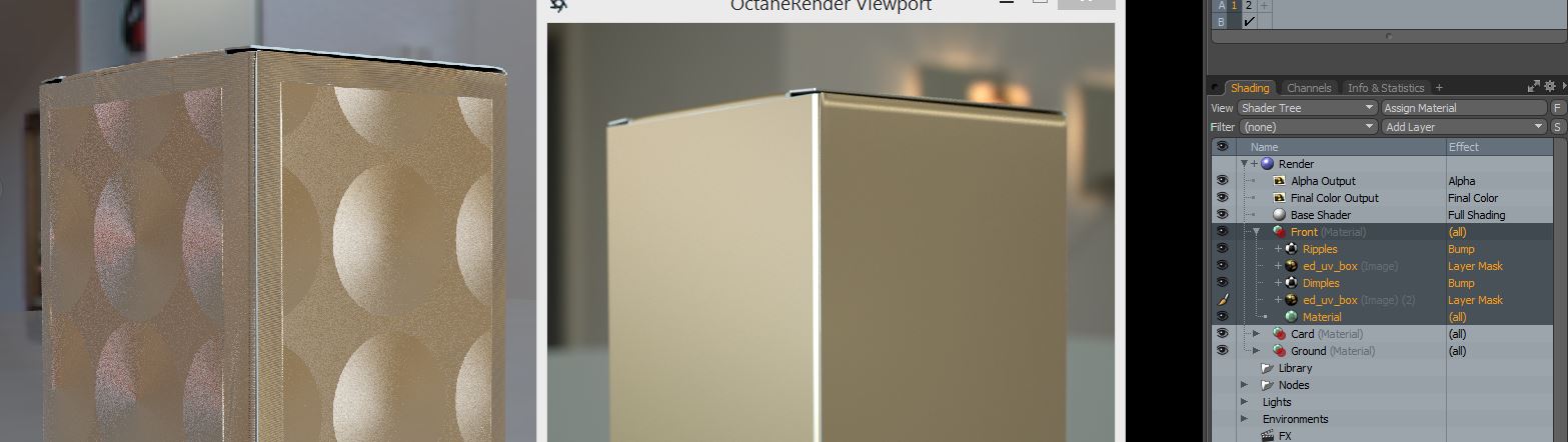I have a carton created with two groups in the shader tree that have separate image map (set as a group mask), materials and bump maps. Both materials are metallic but are next to one another. I have the same alpha mask being used in each group but inverted to each other.