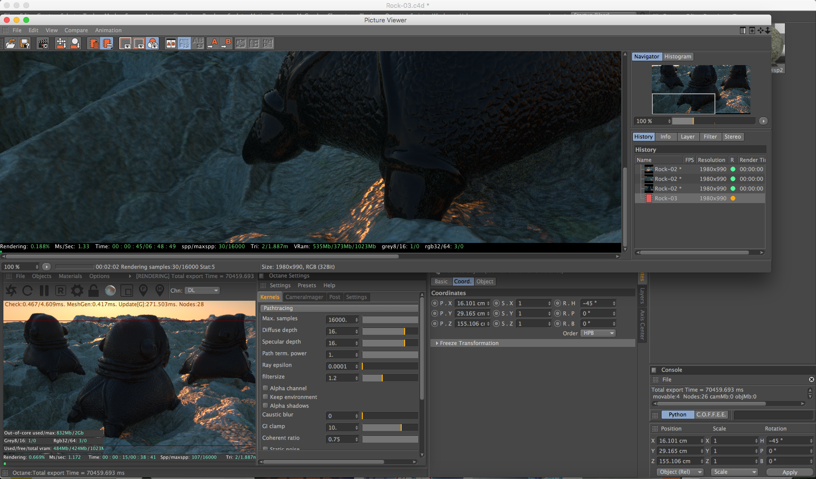 I've been testing both the stable and alpha version of the 2.24 C4D plugin on a Mac Pro OSX 10.11.1, with 24GB of RAM, and Geforce GTX 970 4GB.