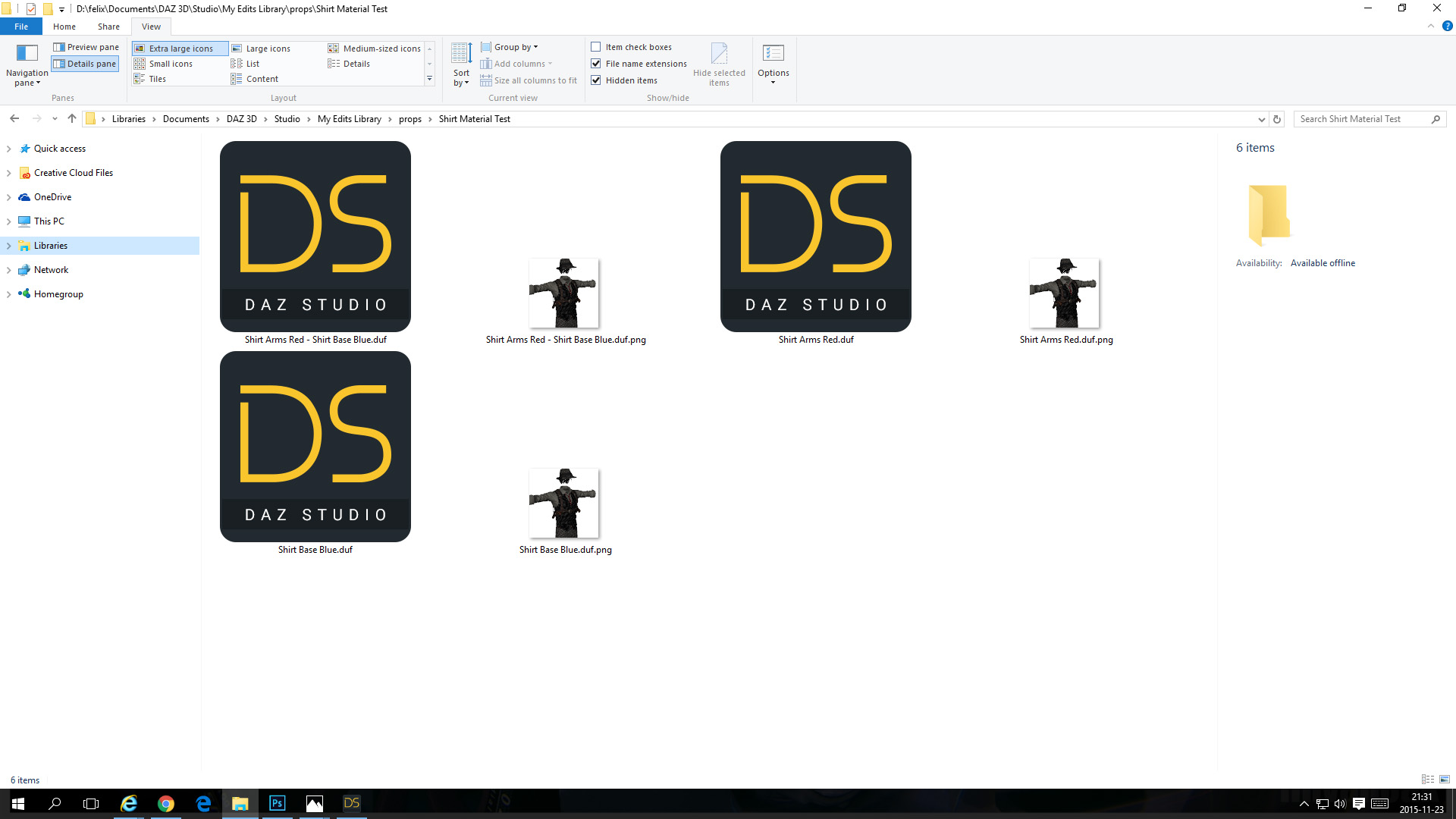 - In the save location you choose you will find the material presets as .duf file and also an preview image that was automatically generated based on the OpenGL color of the shirt.